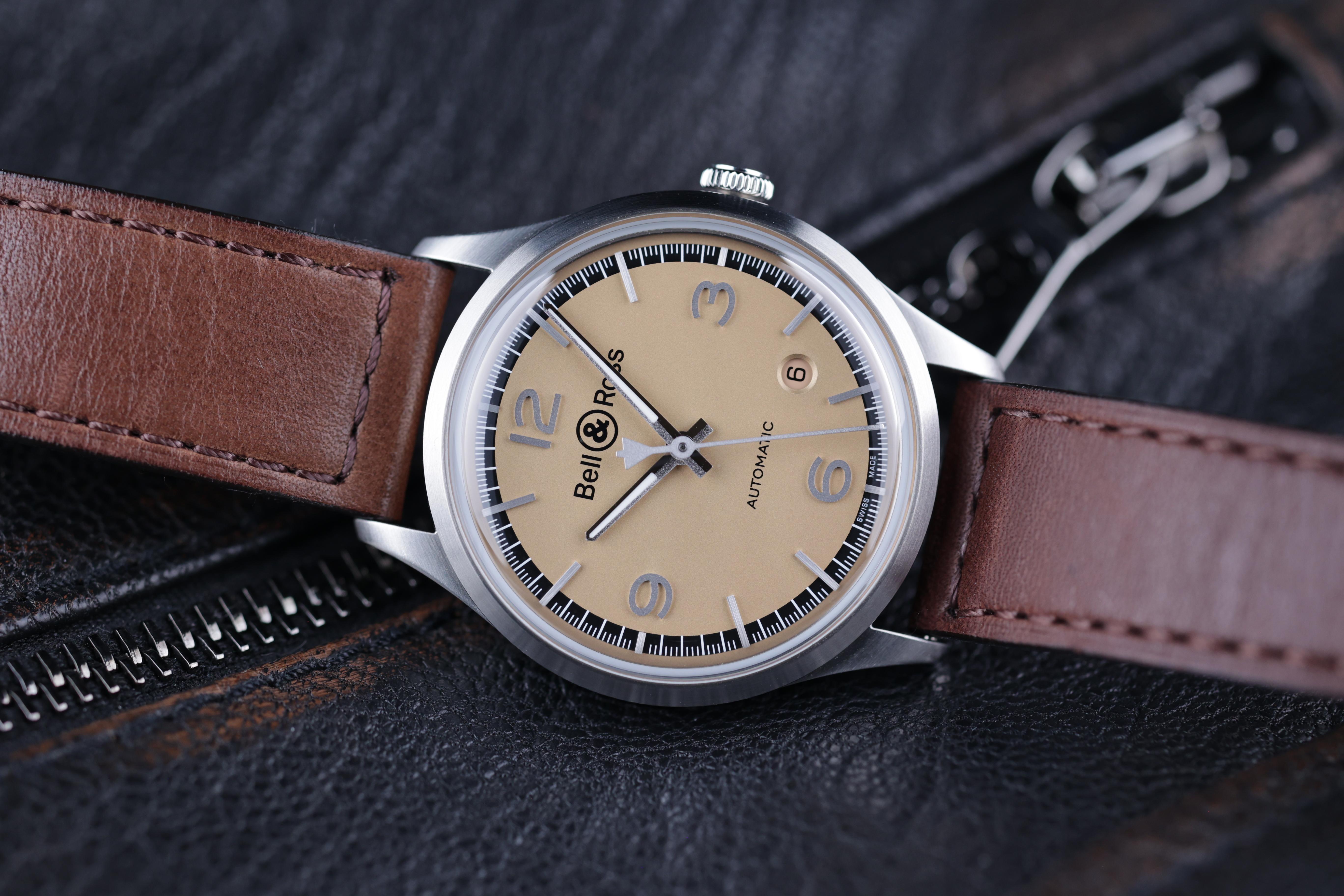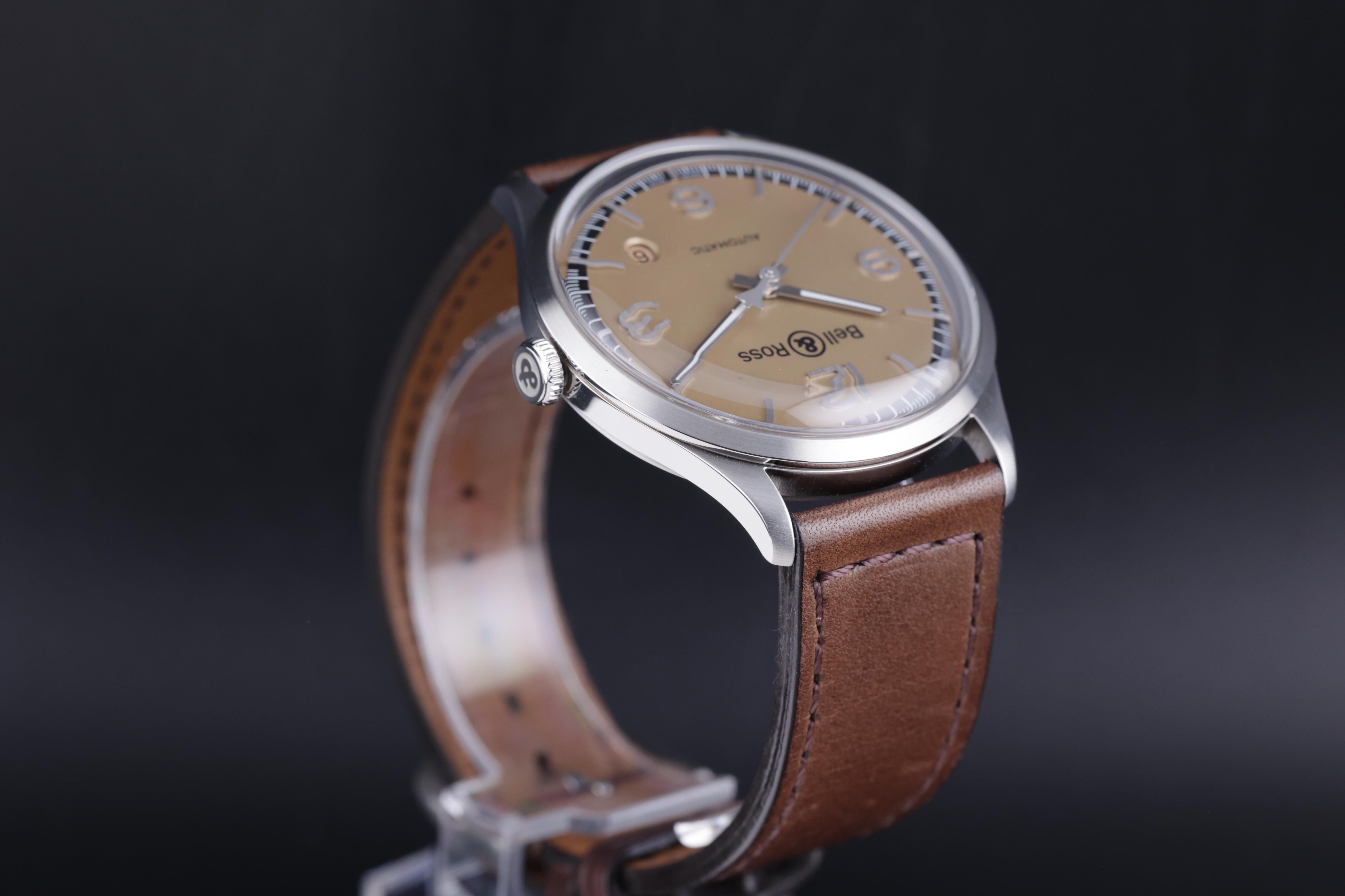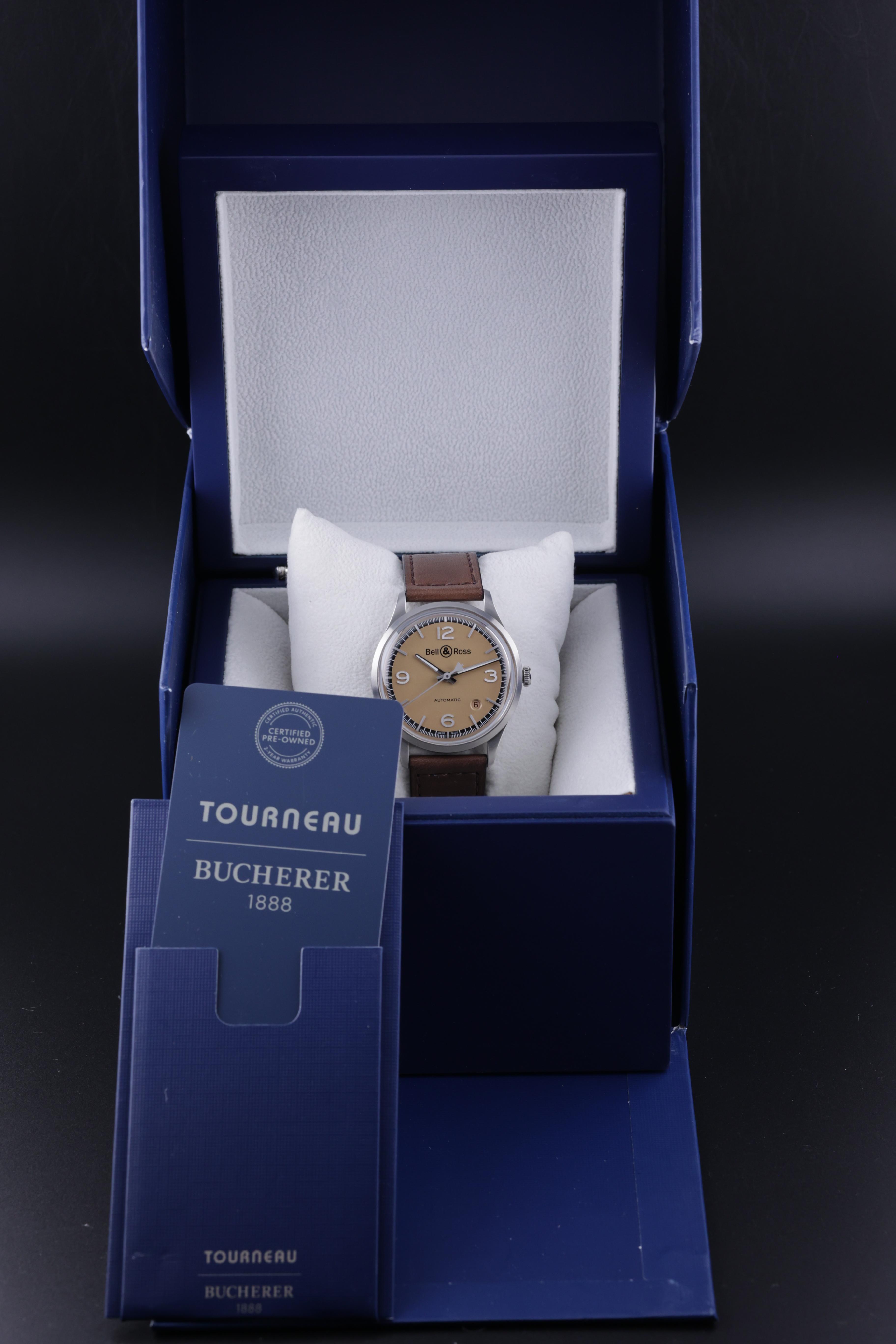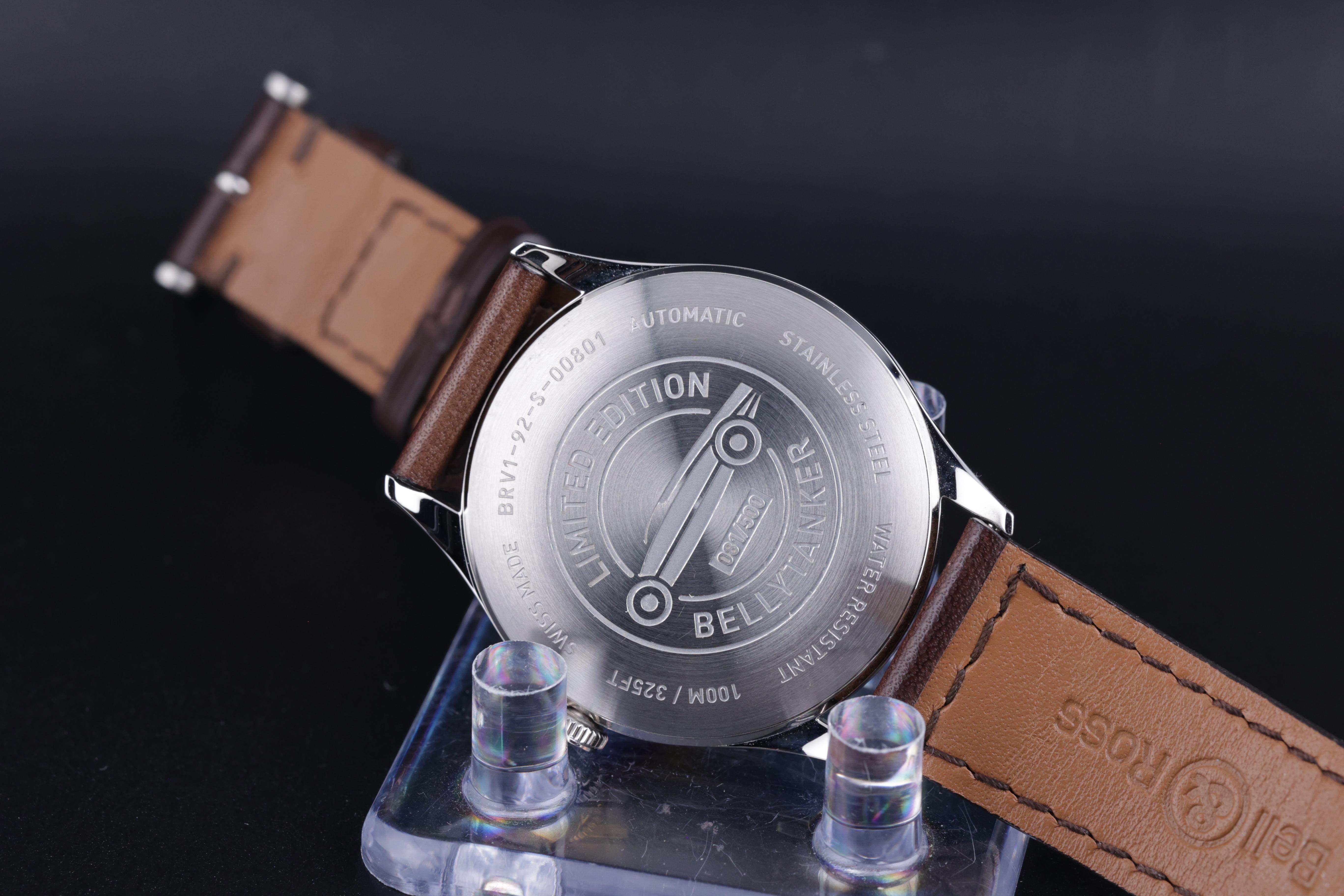 Bell & Ross BR V1-92 Bellytanker, a limited edition watch inspired by the high-speed racecars of the 1950s. With only 500 pieces made, this model features a 38.5mm satin-polished steel case, a gilt dial, and an ultra-curved sapphire crystal, all of which reflect its vintage racing roots. The watch is powered by the automatic BR-CAL.302 movement and comes on a brown calfskin strap. It’s a perfect blend of modern watchmaking and nostalgic design, capturing the spirit of classic automotive culture. As shown, it comes with a Tourneau box and registration card.