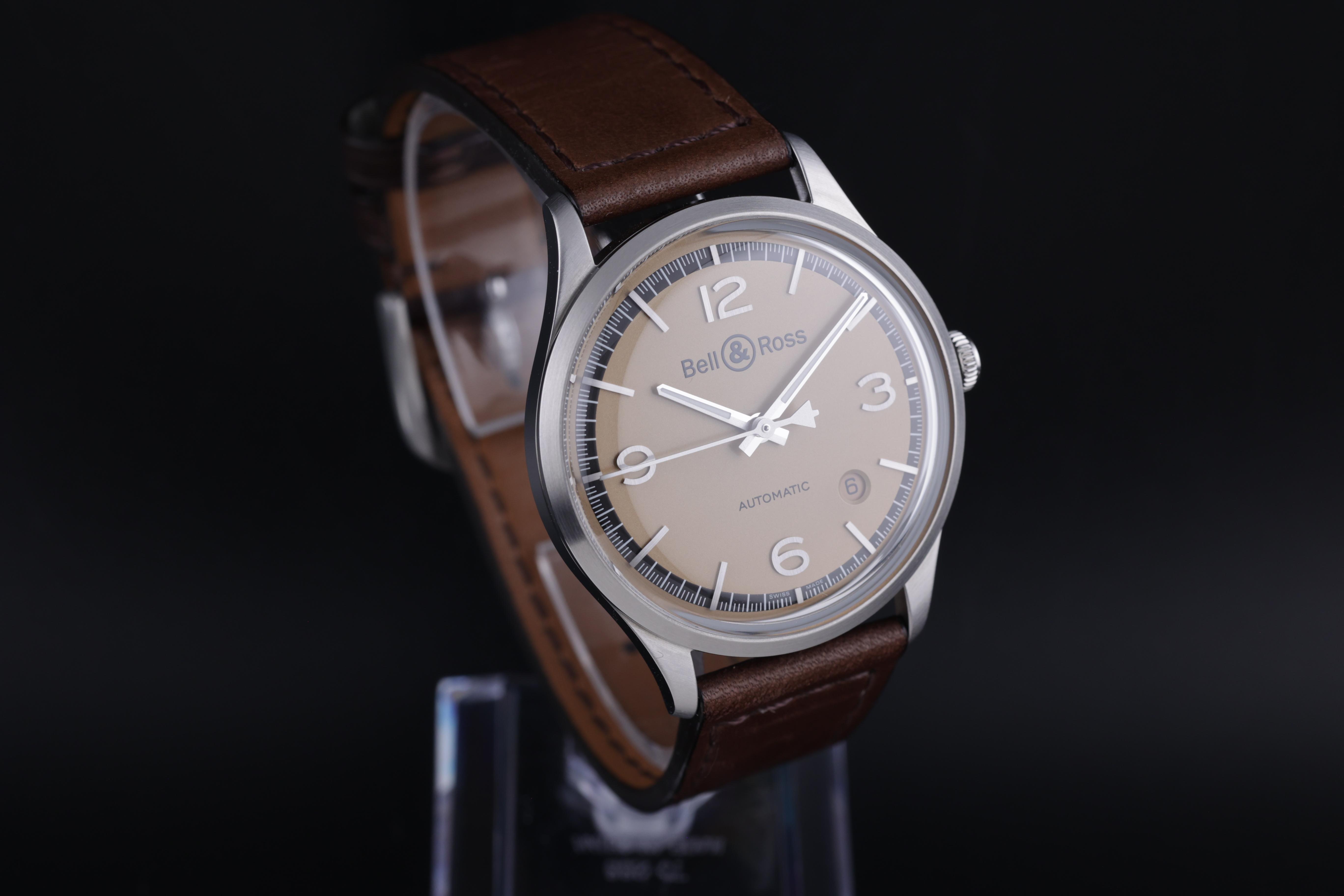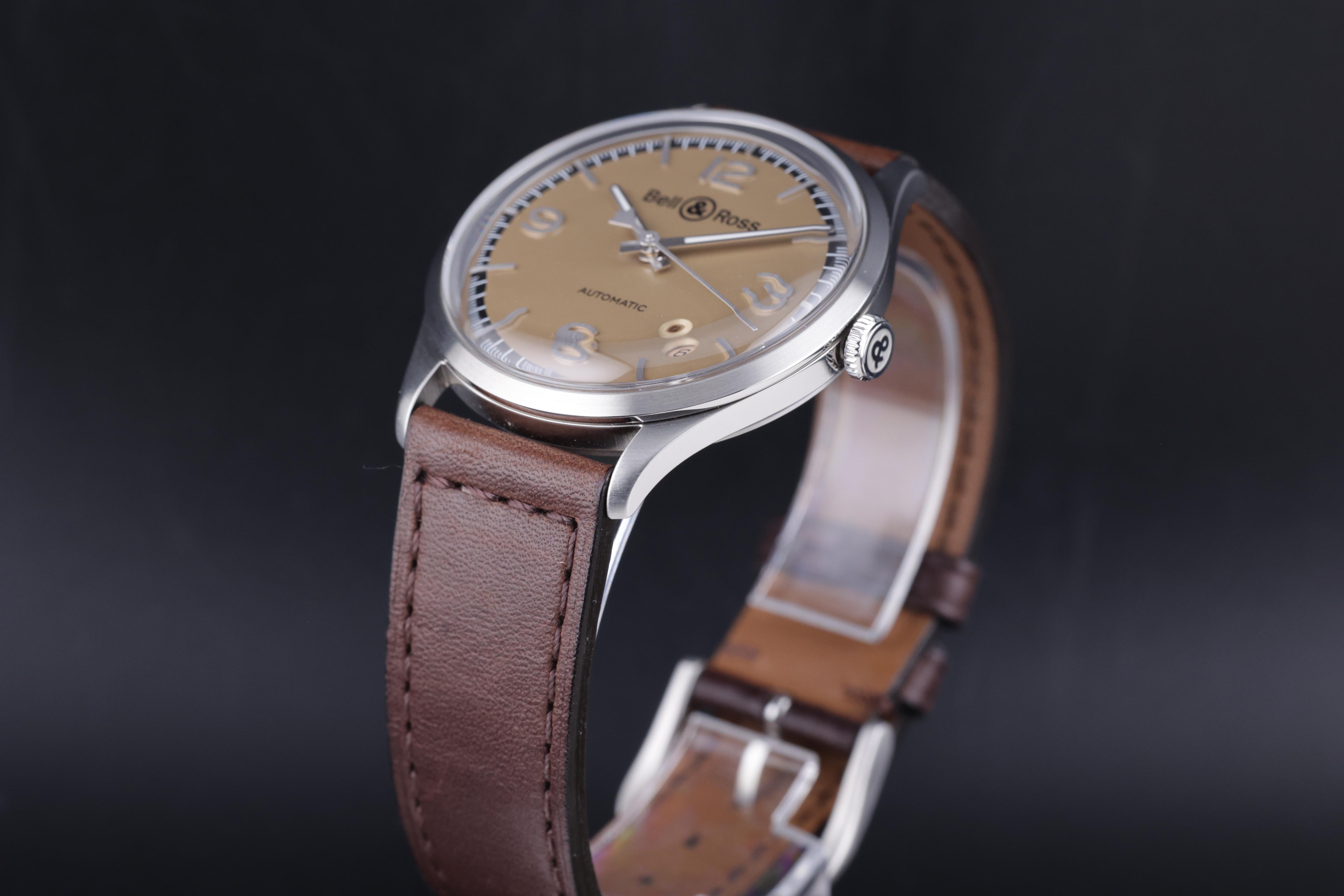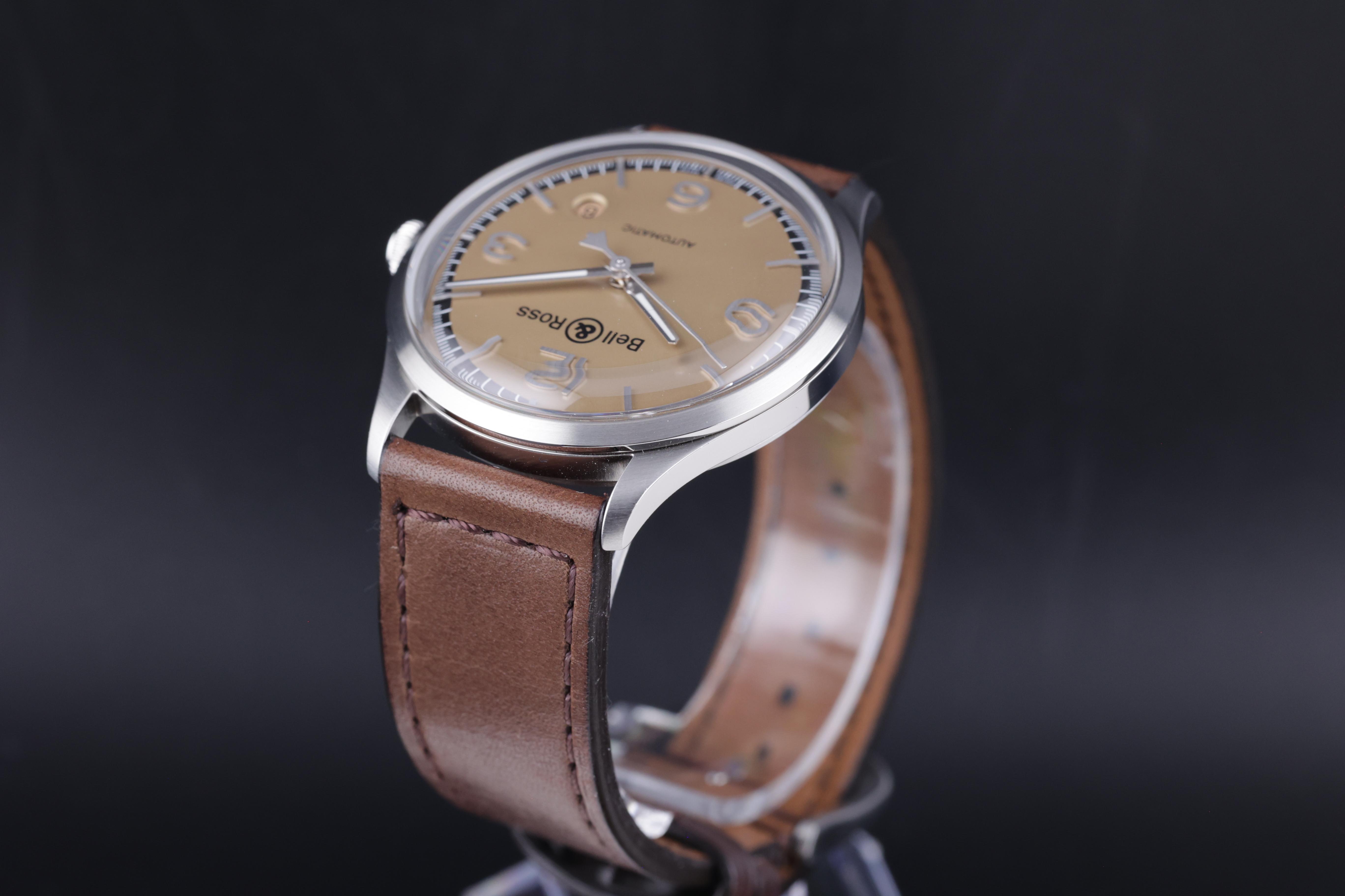 Bell & Ross BR V1-92 Bellytanker, a limited edition watch inspired by the high-speed racecars of the 1950s. With only 500 pieces made, this model features a 38.5mm satin-polished steel case, a gilt dial, and an ultra-curved sapphire crystal, all of which reflect its vintage racing roots. The watch is powered by the automatic BR-CAL.302 movement and comes on a brown calfskin strap. It’s a perfect blend of modern watchmaking and nostalgic design, capturing the spirit of classic automotive culture. As shown, it comes with a Tourneau box and registration card.