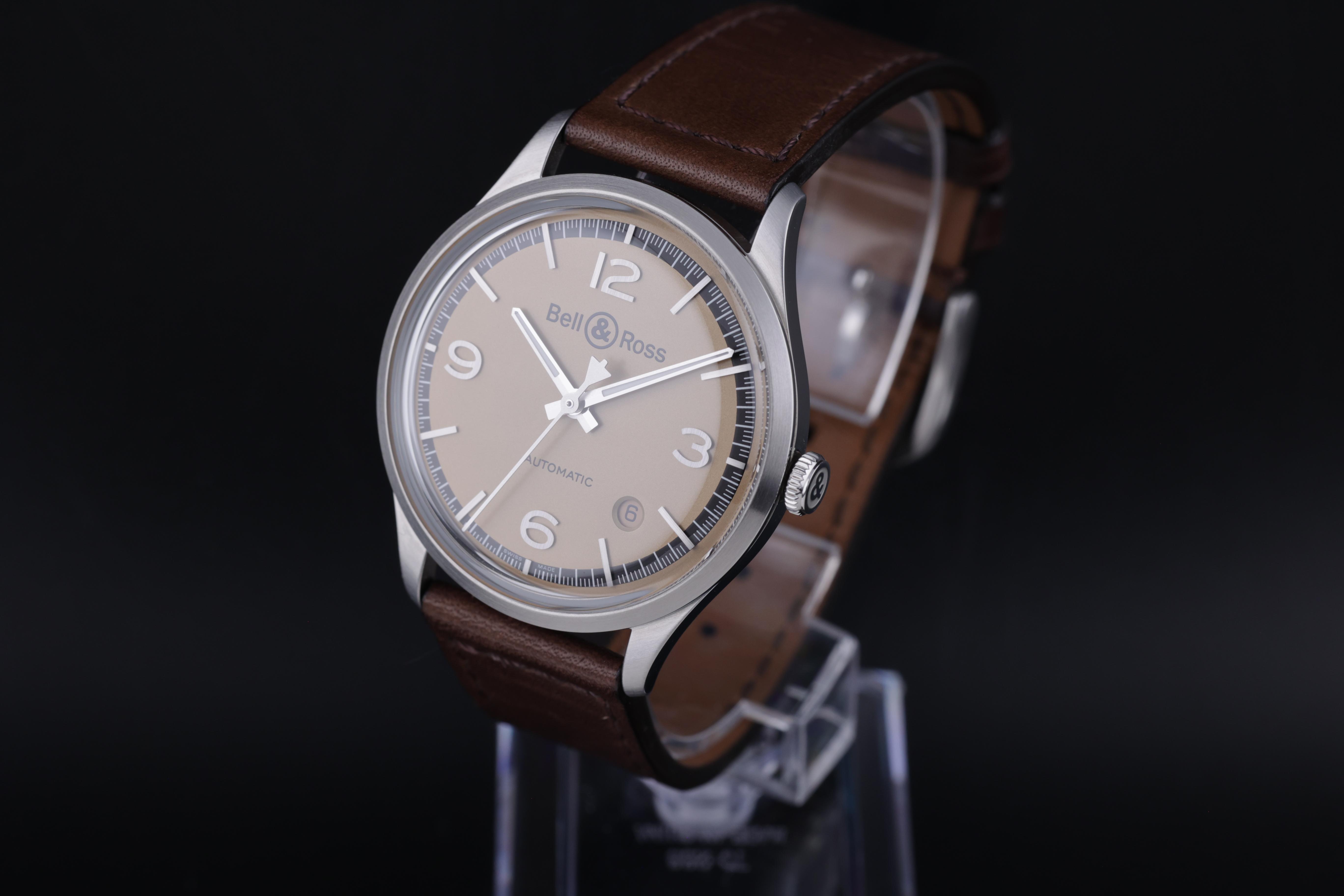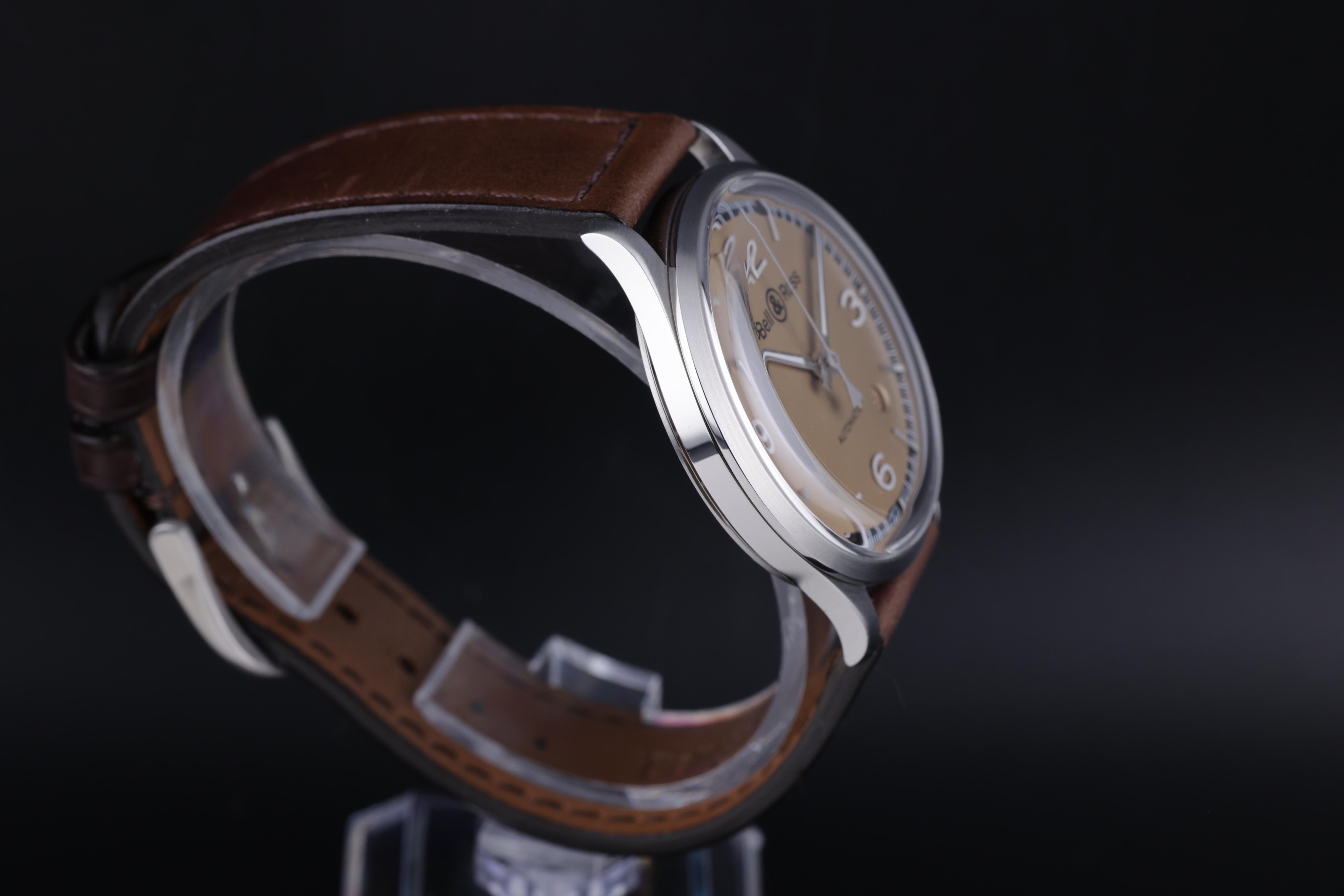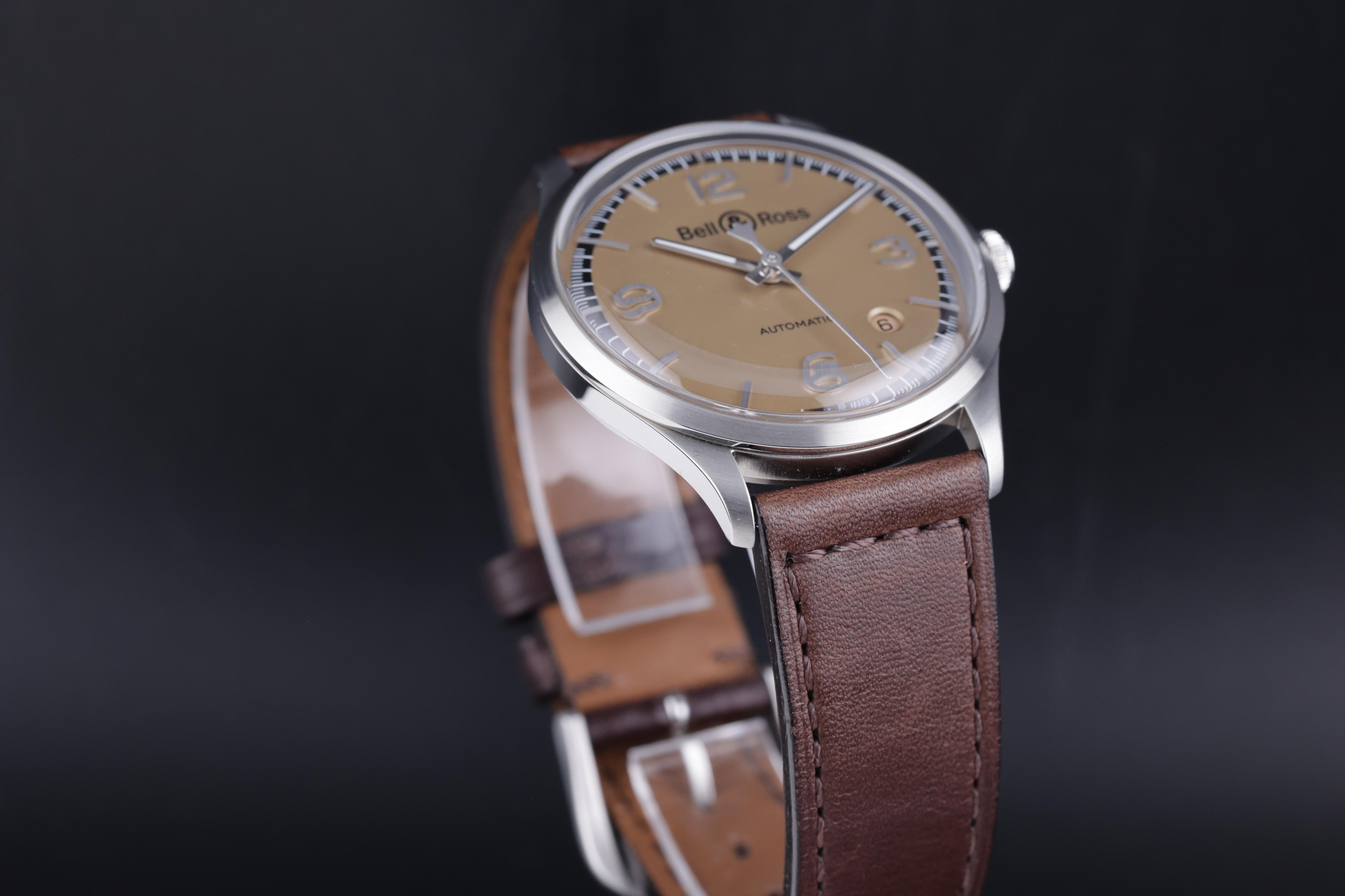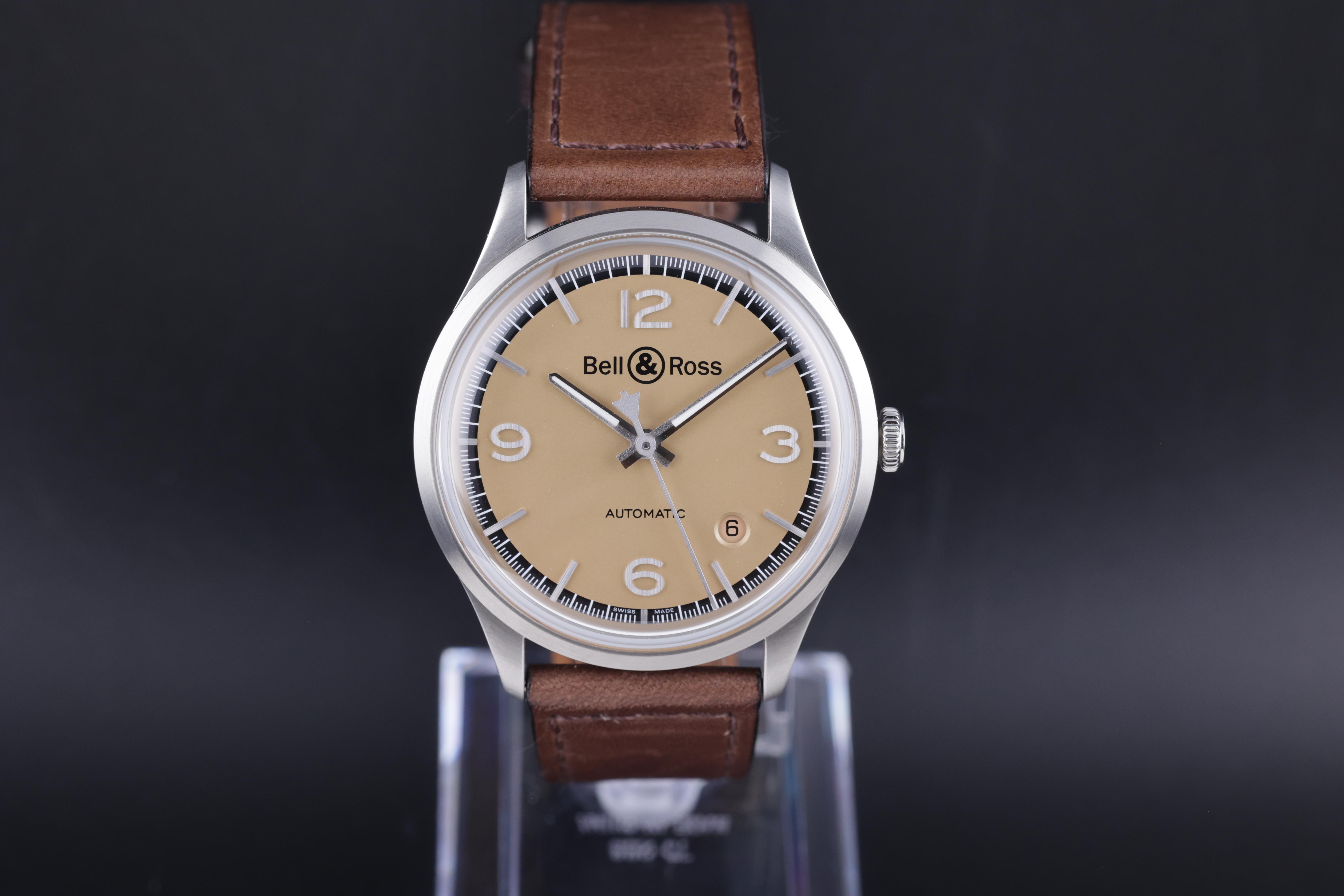Bell & Ross BR V1-92 Bellytanker, a limited edition watch inspired by the high-speed racecars of the 1950s. With only 500 pieces made, this model features a 38.5mm satin-polished steel case, a gilt dial, and an ultra-curved sapphire crystal, all of which reflect its vintage racing roots. The watch is powered by the automatic BR-CAL.302 movement and comes on a brown calfskin strap. It’s a perfect blend of modern watchmaking and nostalgic design, capturing the spirit of classic automotive culture. As shown, it comes with a Tourneau box and registration card.