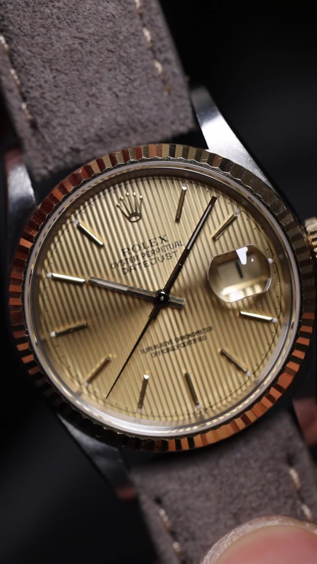 Stunning ROLEX DateJust 16233 from 1989. Beautiful tapestry dial, sharp corners on the 36mm case, flat facets on the fluted bezel, all make this watch pop. Running strong with an amplitude just under 300 degrees, this piece is ready for the next long-term owner.