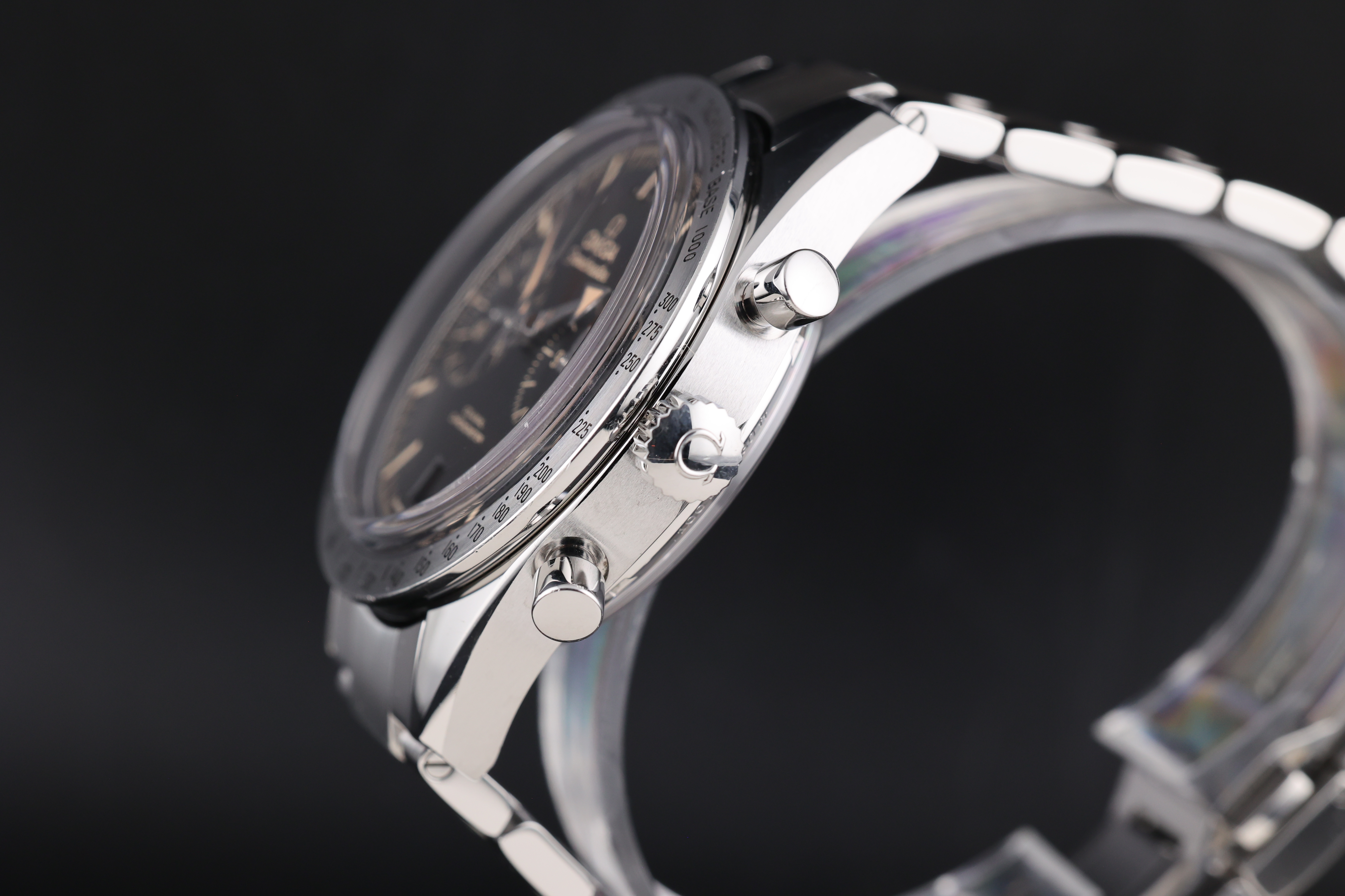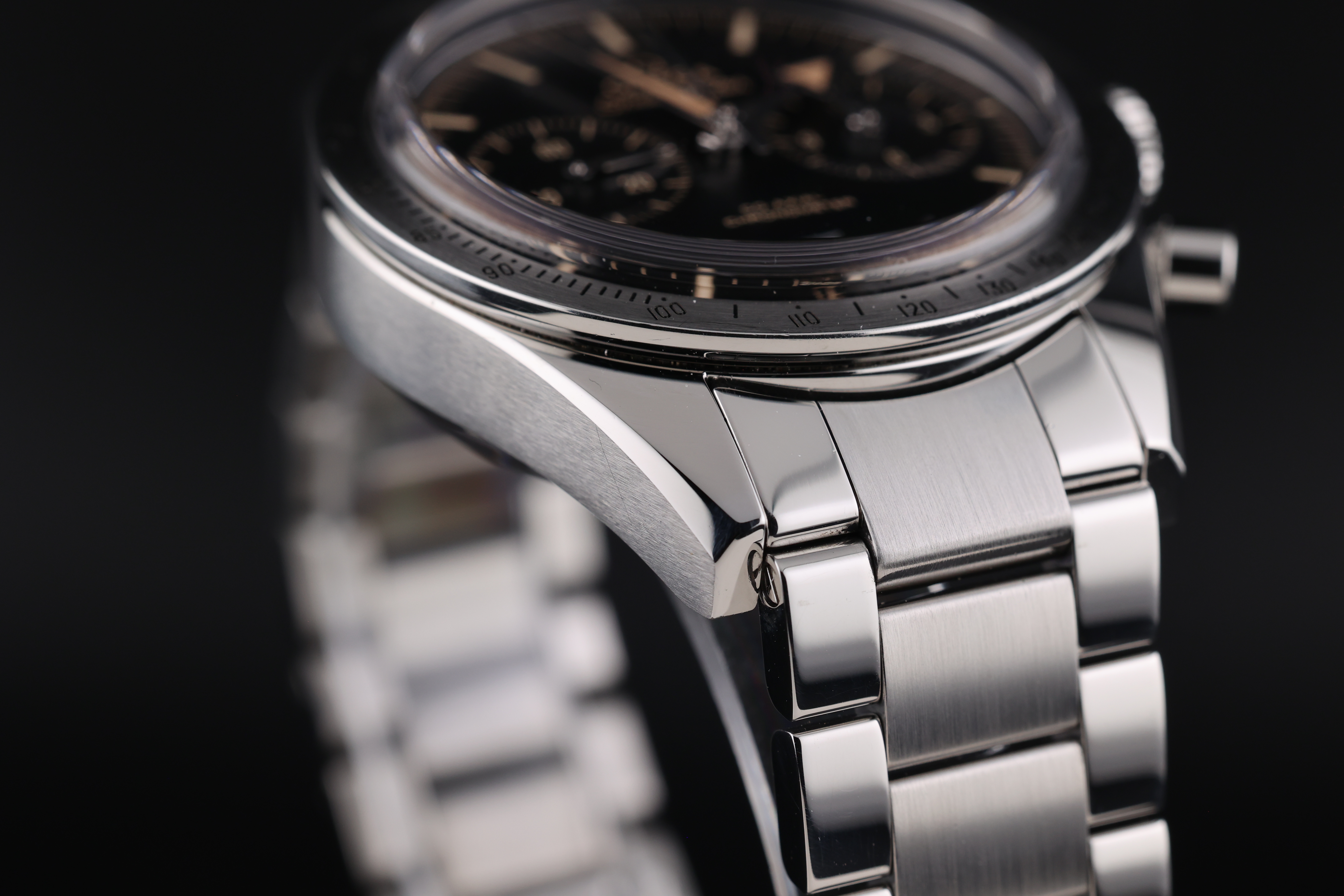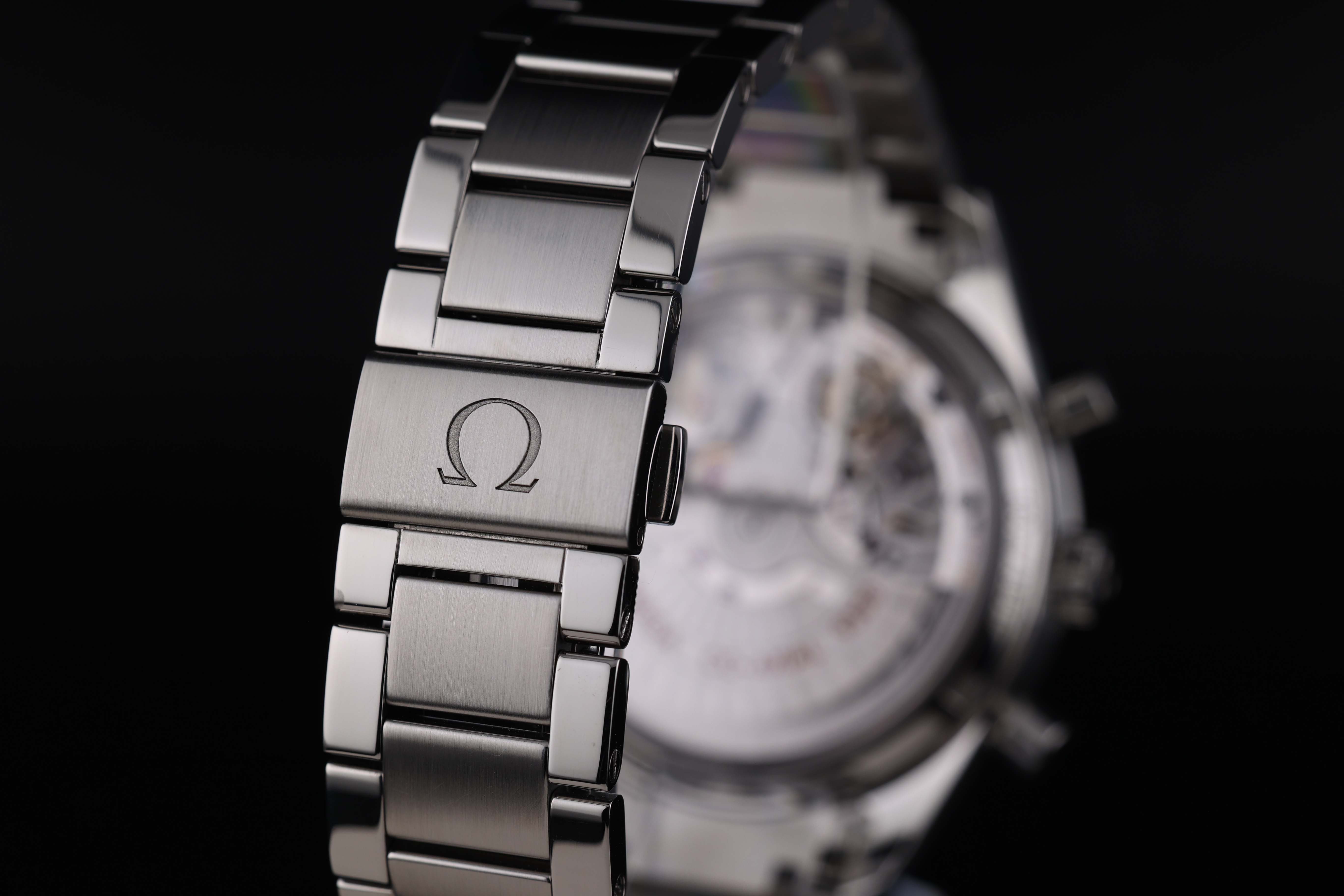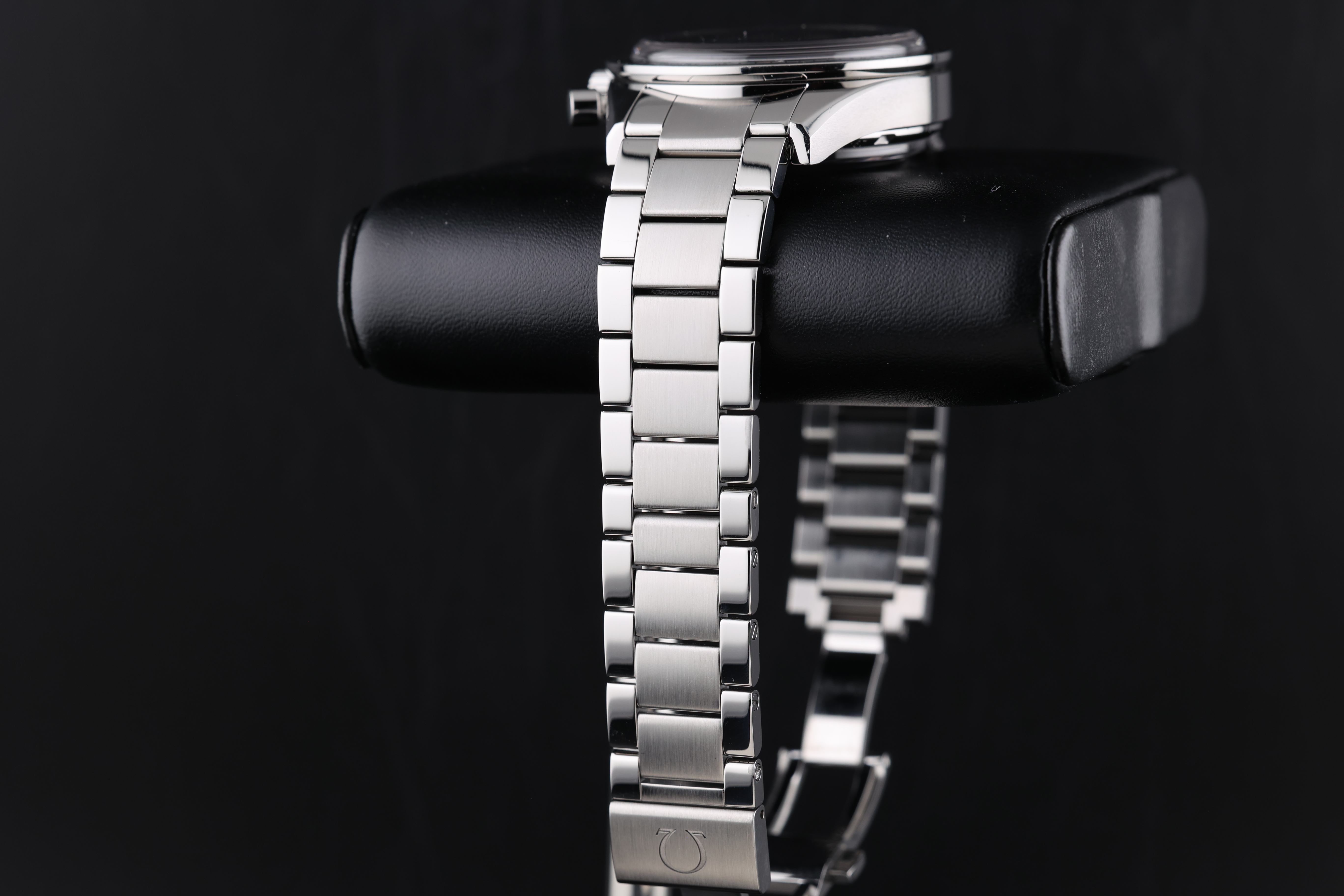 The black dial is beautifully balanced with two symmetrical chronograph registers, maintaining a clean and legible layout while retaining the Speedmaster’s signature design language. The broad arrow hands and vintage-inspired indices add warmth and character to the watch, evoking the charm of classic models.