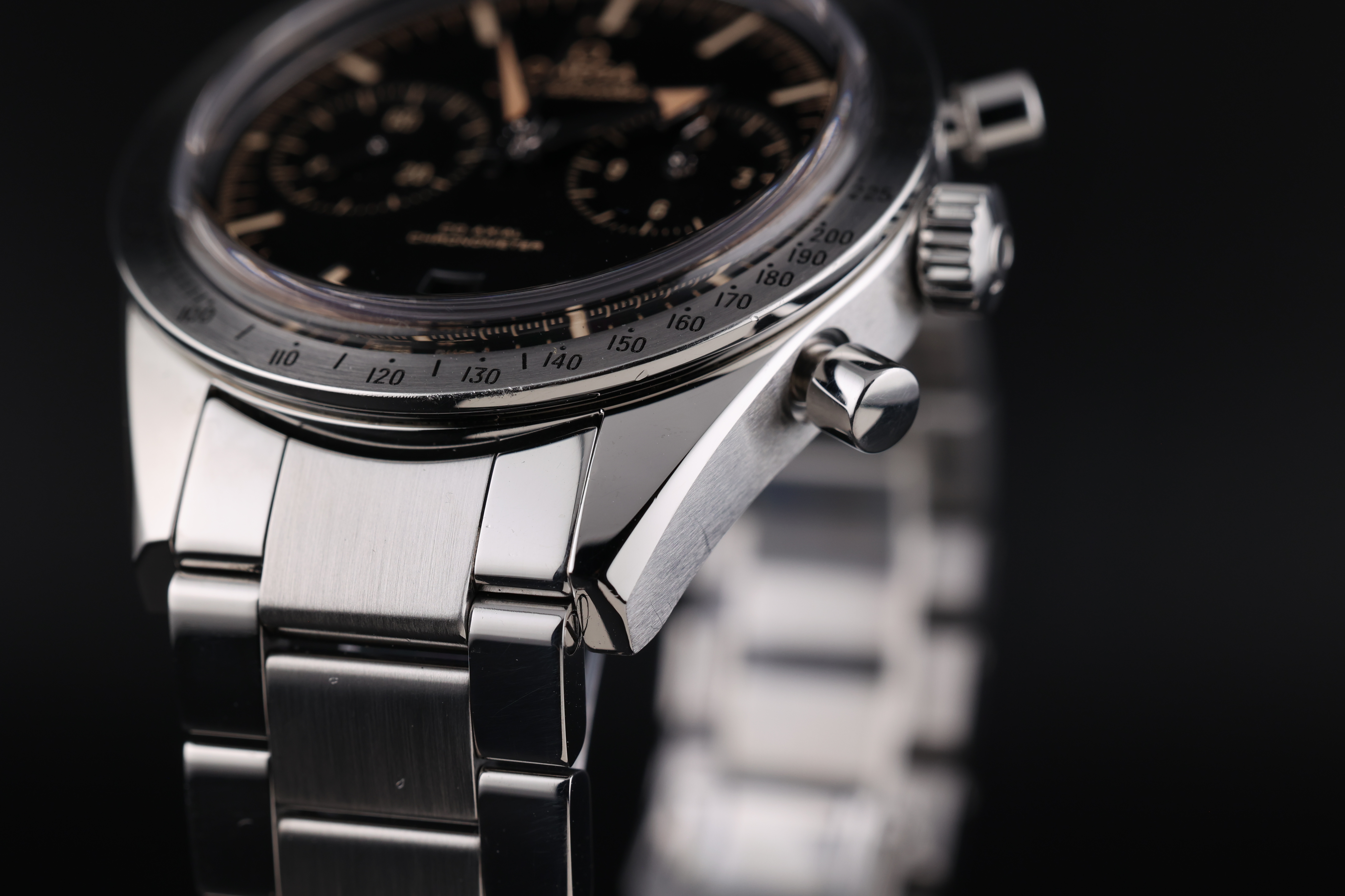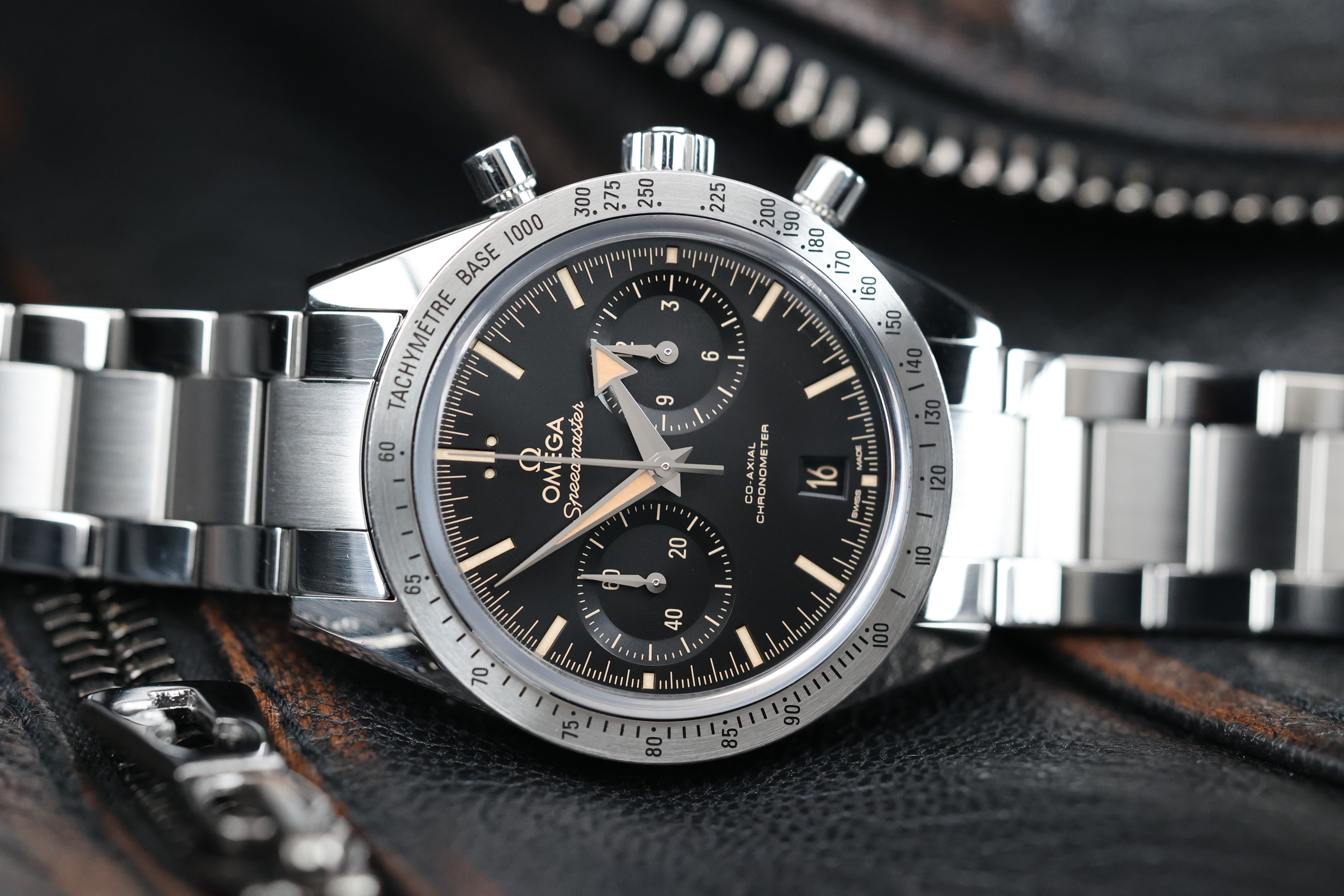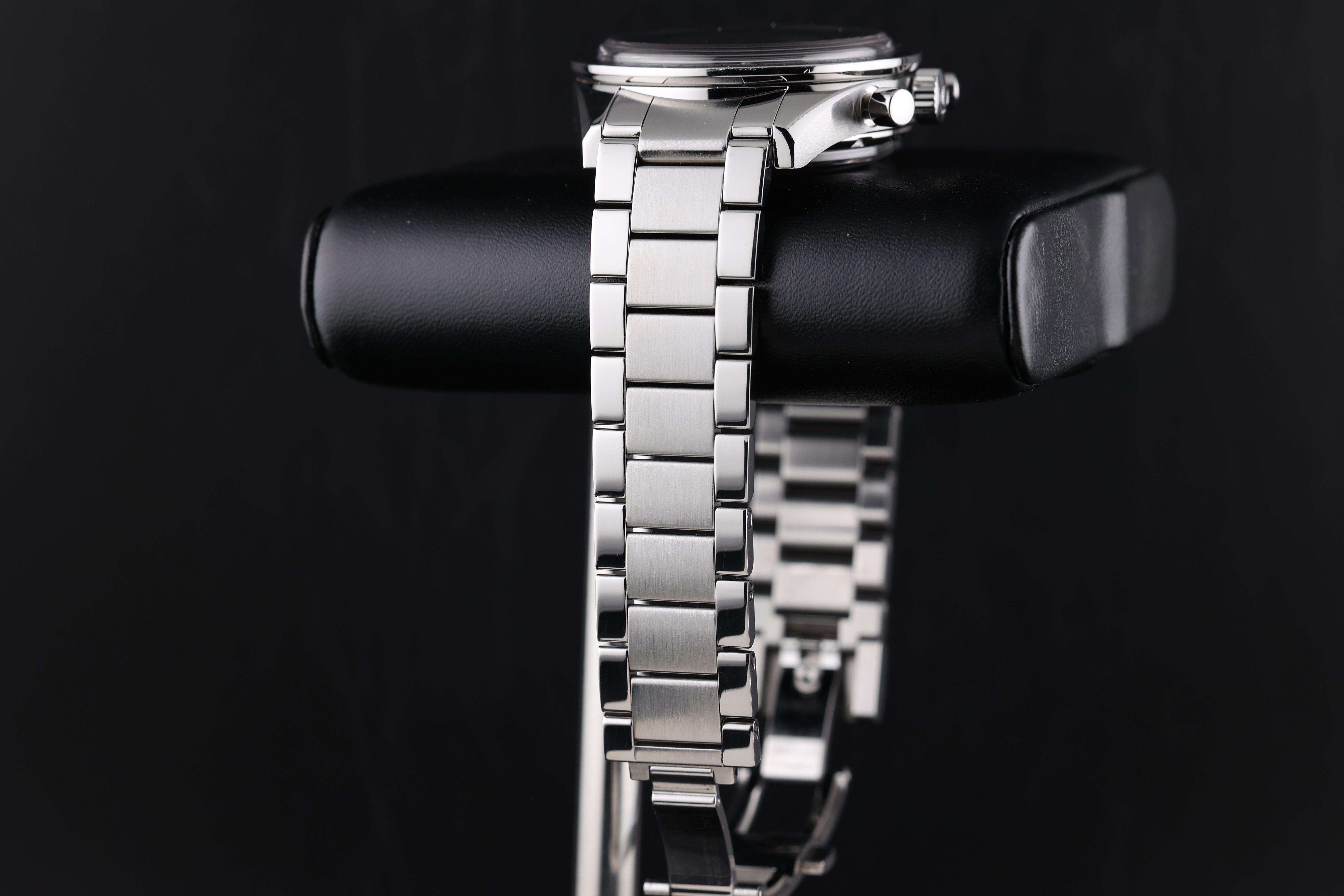 The black dial is beautifully balanced with two symmetrical chronograph registers, maintaining a clean and legible layout while retaining the Speedmaster’s signature design language. The broad arrow hands and vintage-inspired indices add warmth and character to the watch, evoking the charm of classic models.