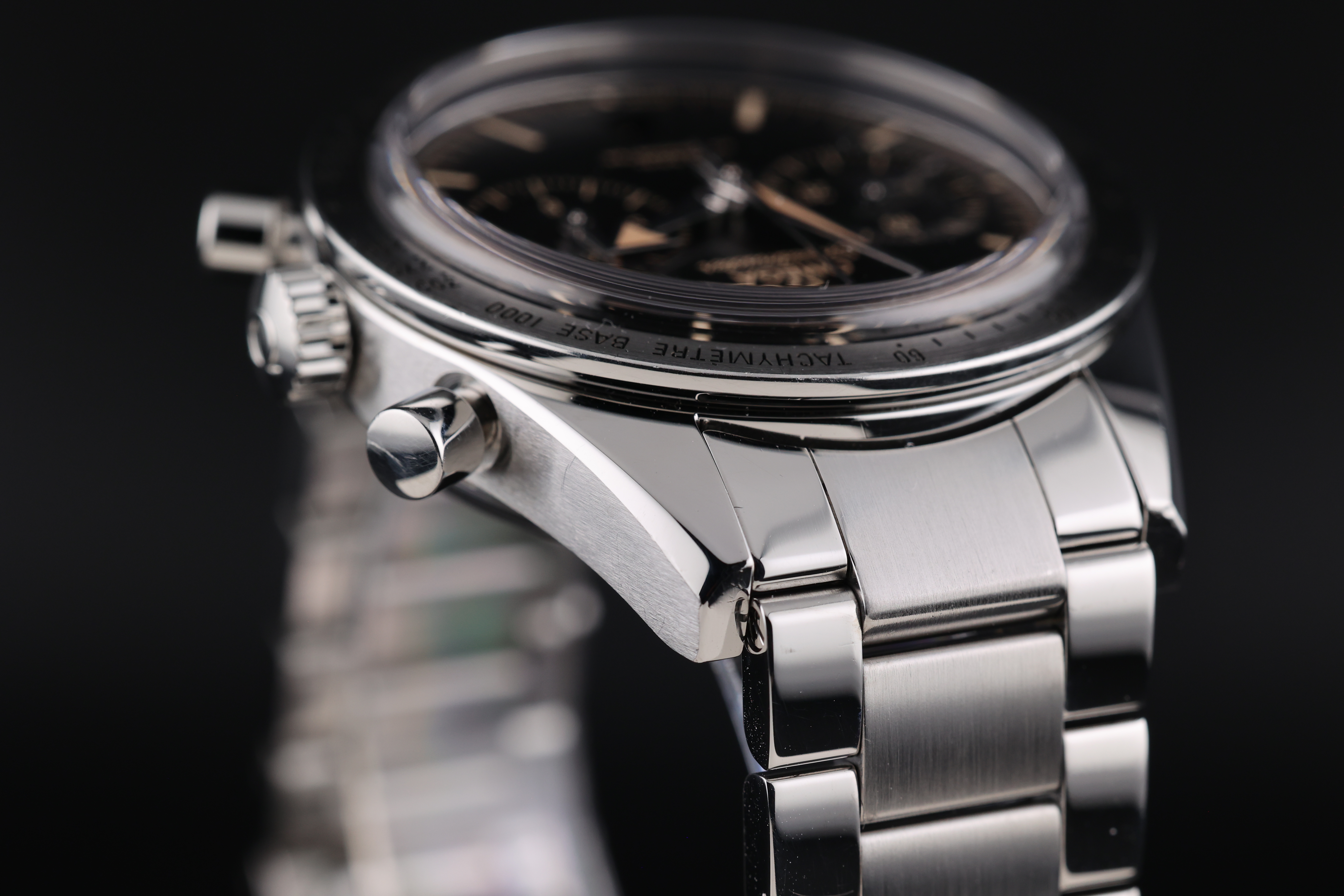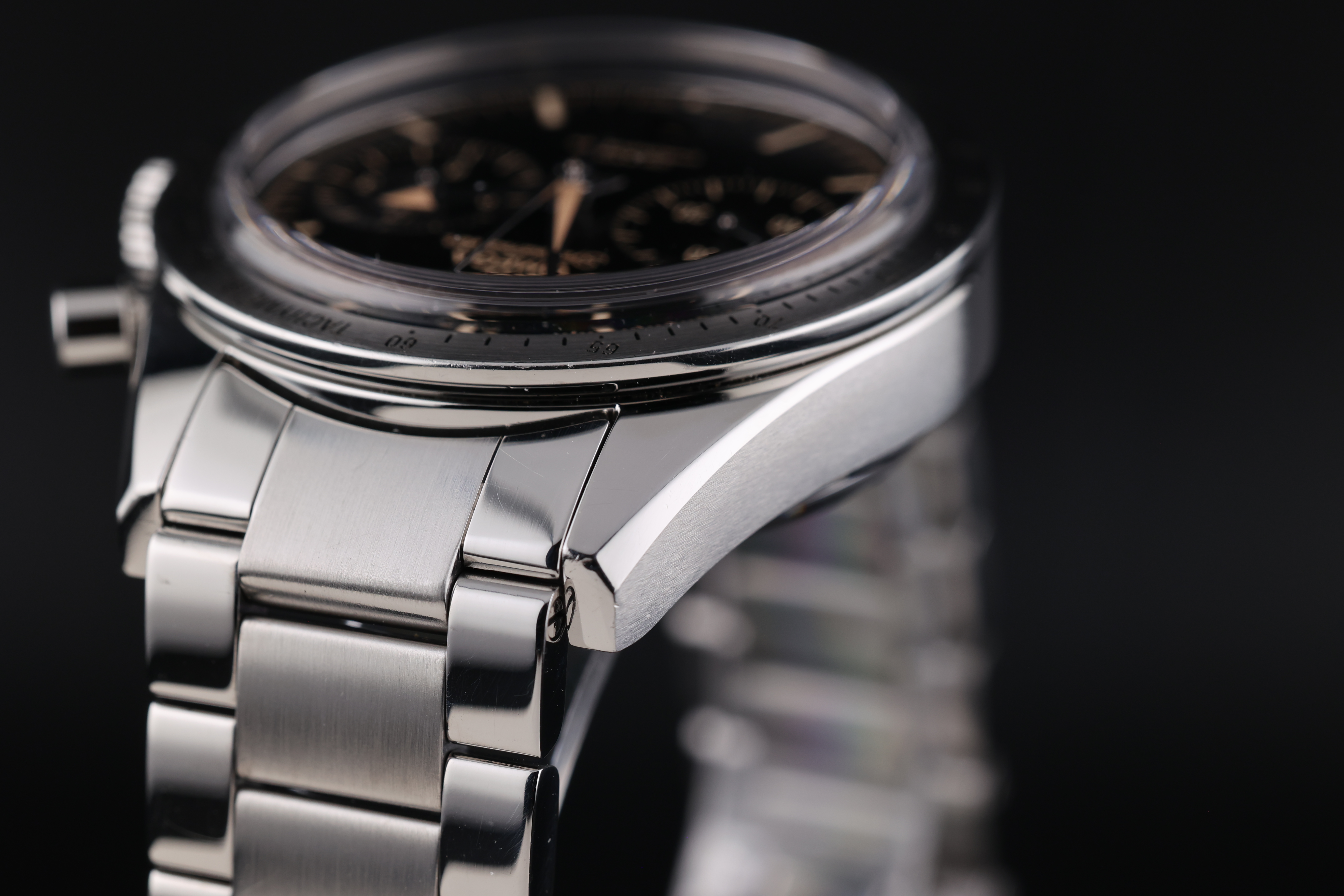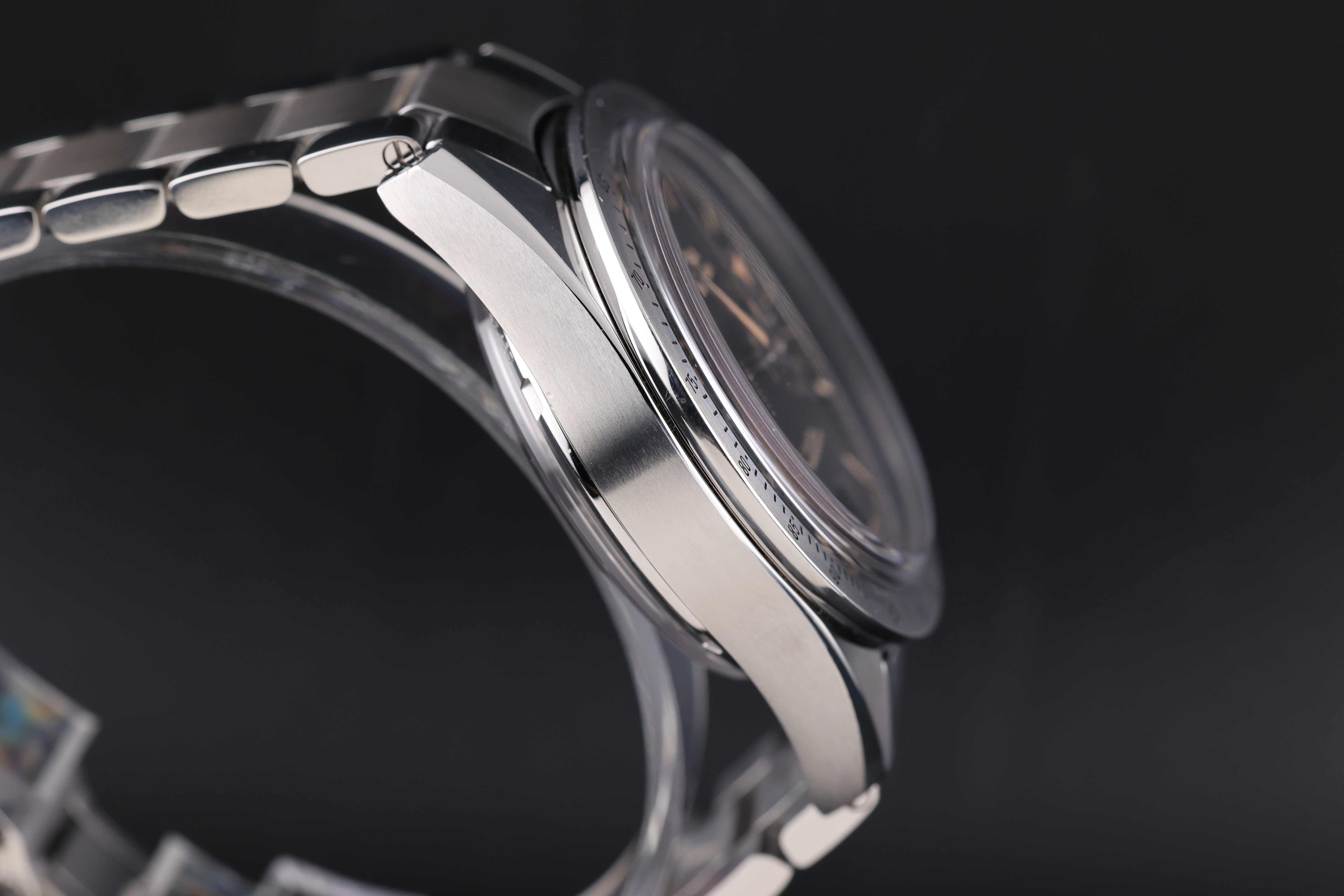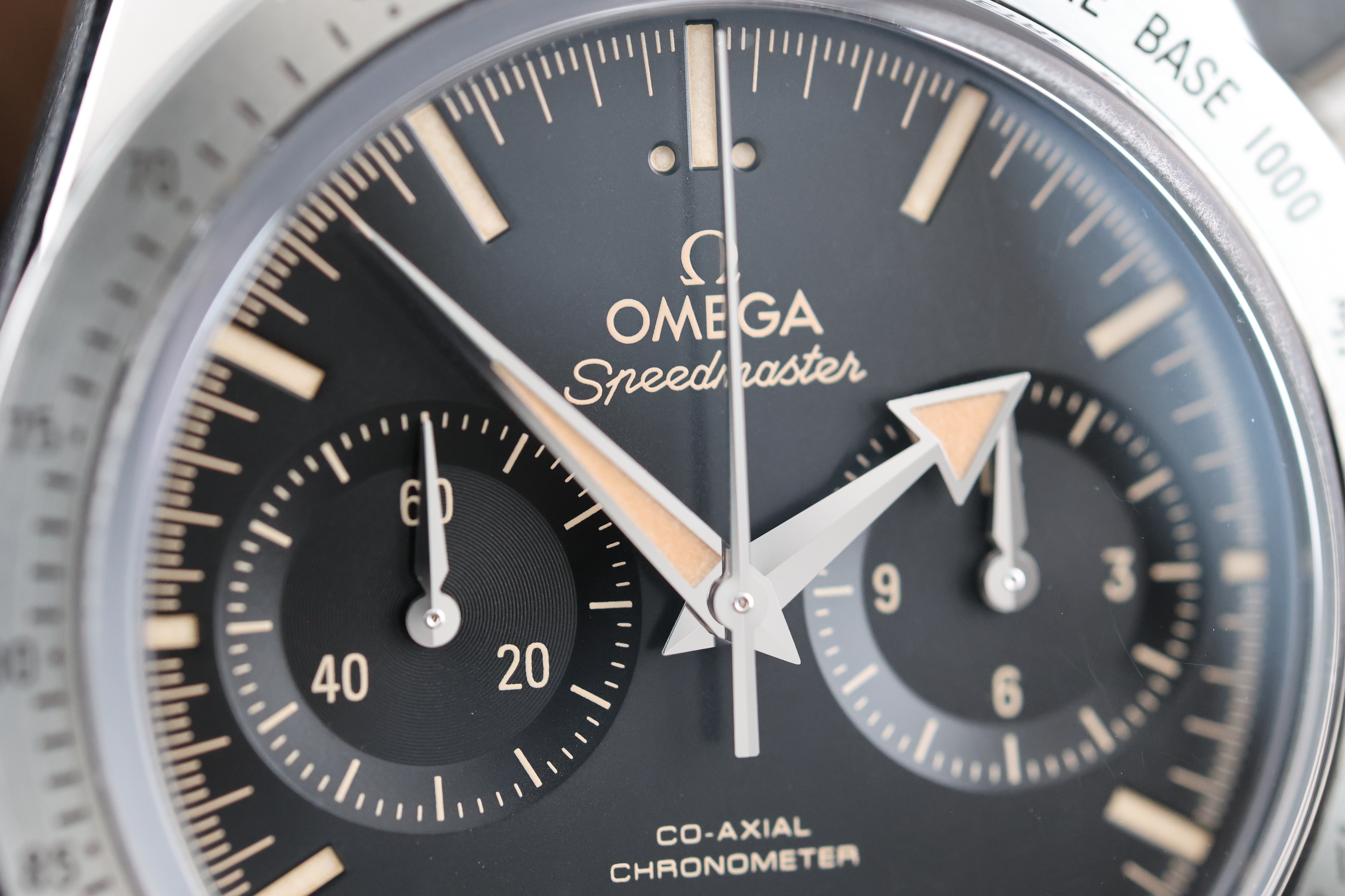 The black dial is beautifully balanced with two symmetrical chronograph registers, maintaining a clean and legible layout while retaining the Speedmaster’s signature design language. The broad arrow hands and vintage-inspired indices add warmth and character to the watch, evoking the charm of classic models.