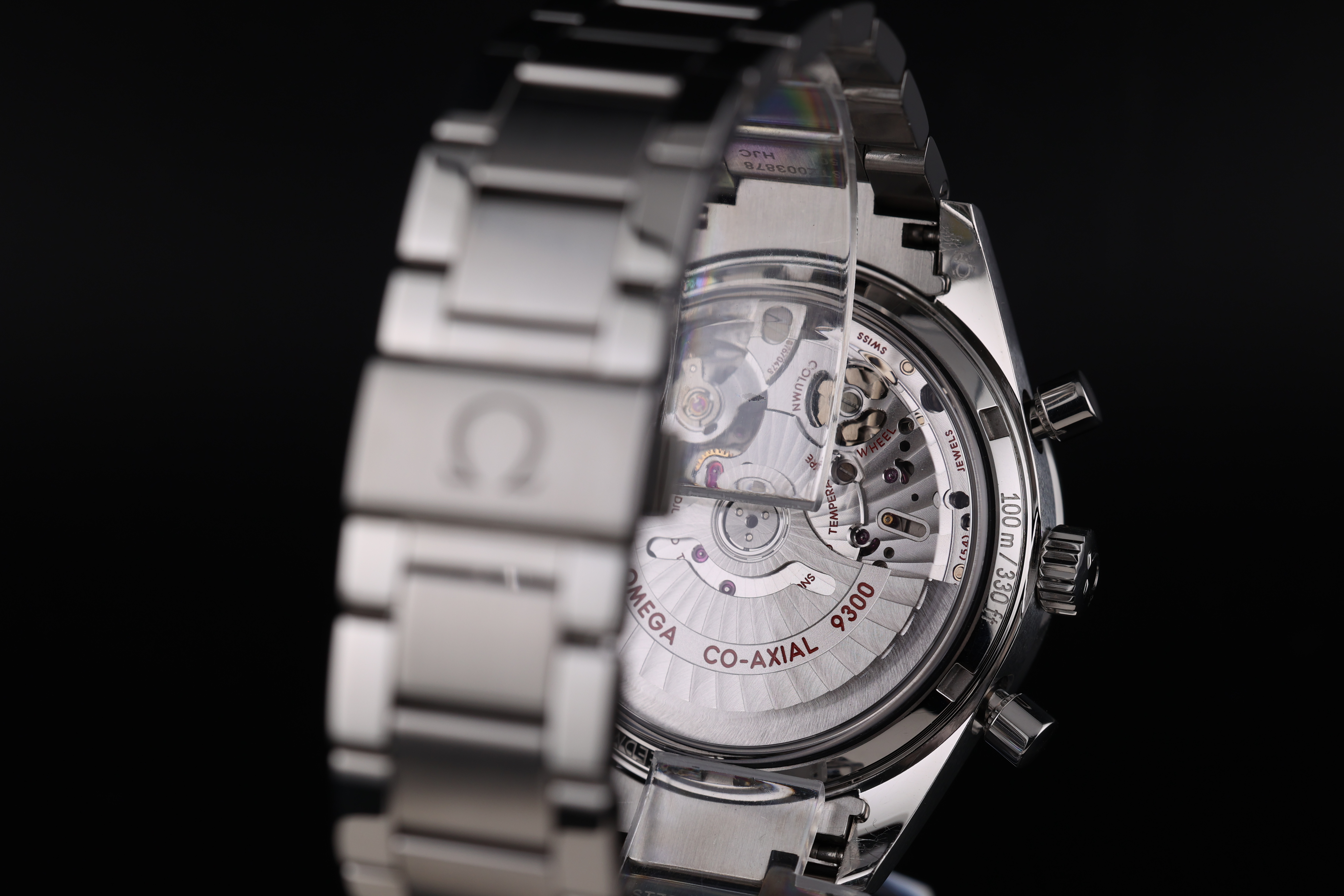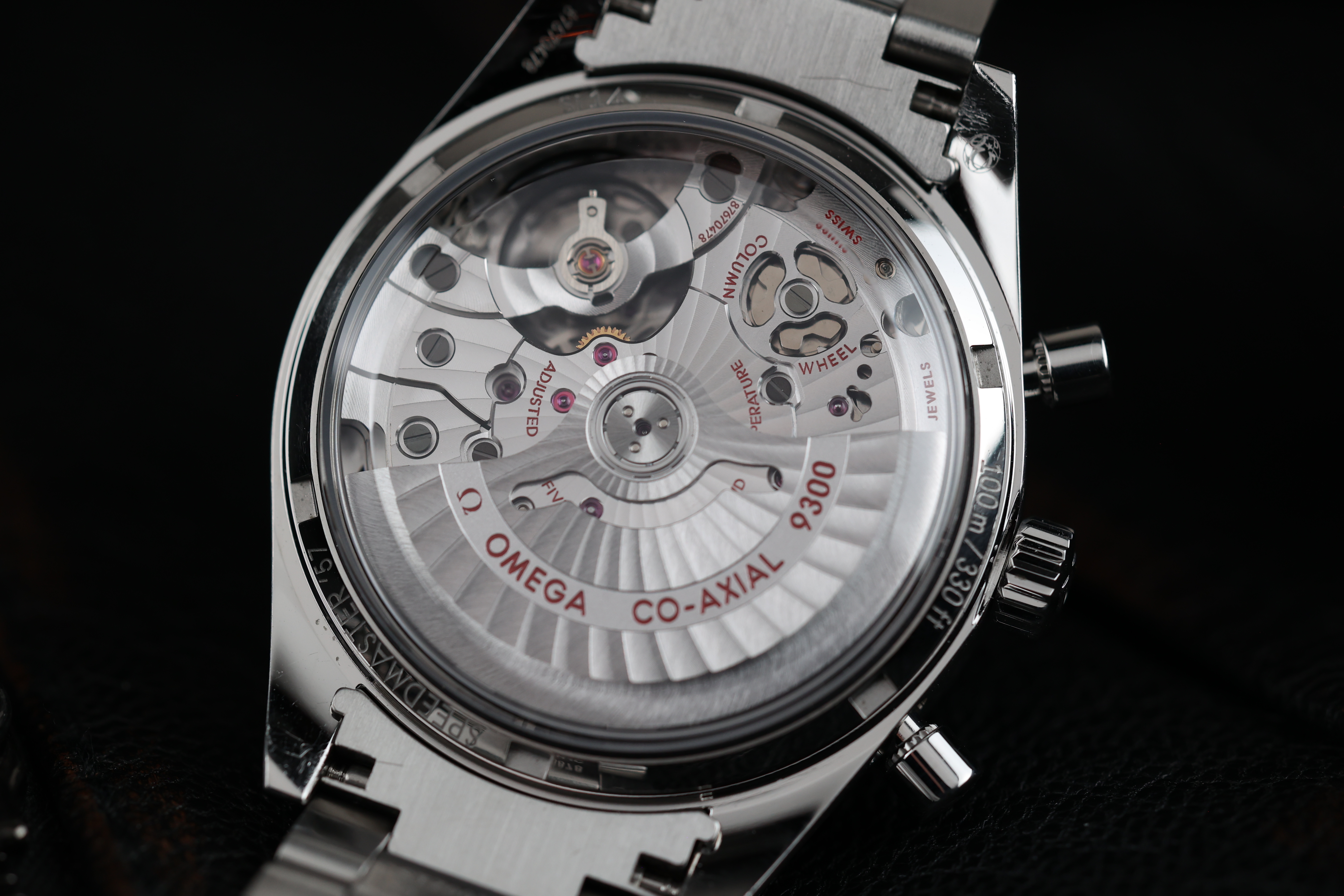 Turning the watch over reveals a sapphire exhibition caseback, showcasing the impressive movement within. The finely decorated Co-Axial 9300 movement sits beautifully behind the crystal, allowing the owner to admire the intricate mechanics of the chronograph just as much as the stunning exterior.