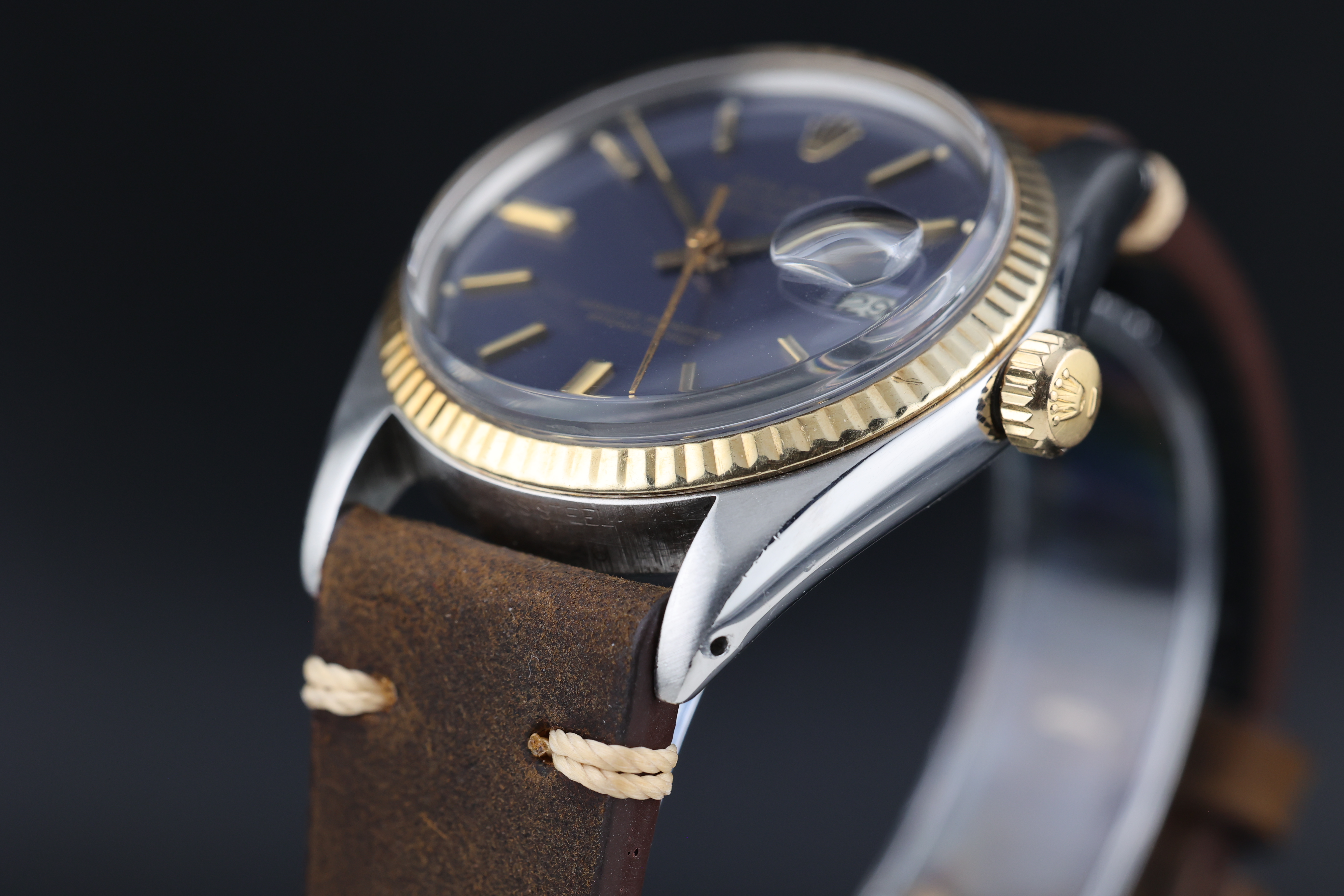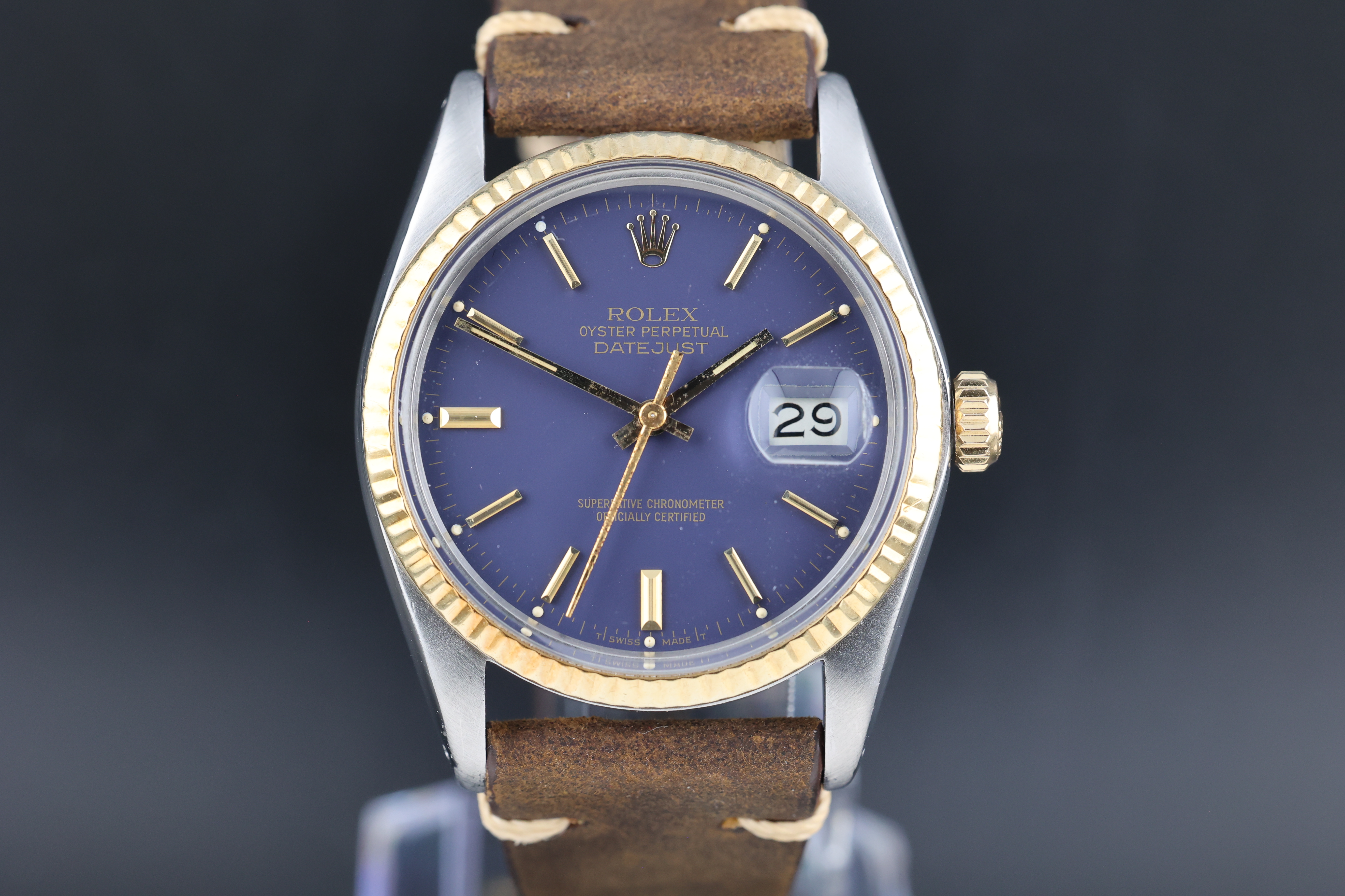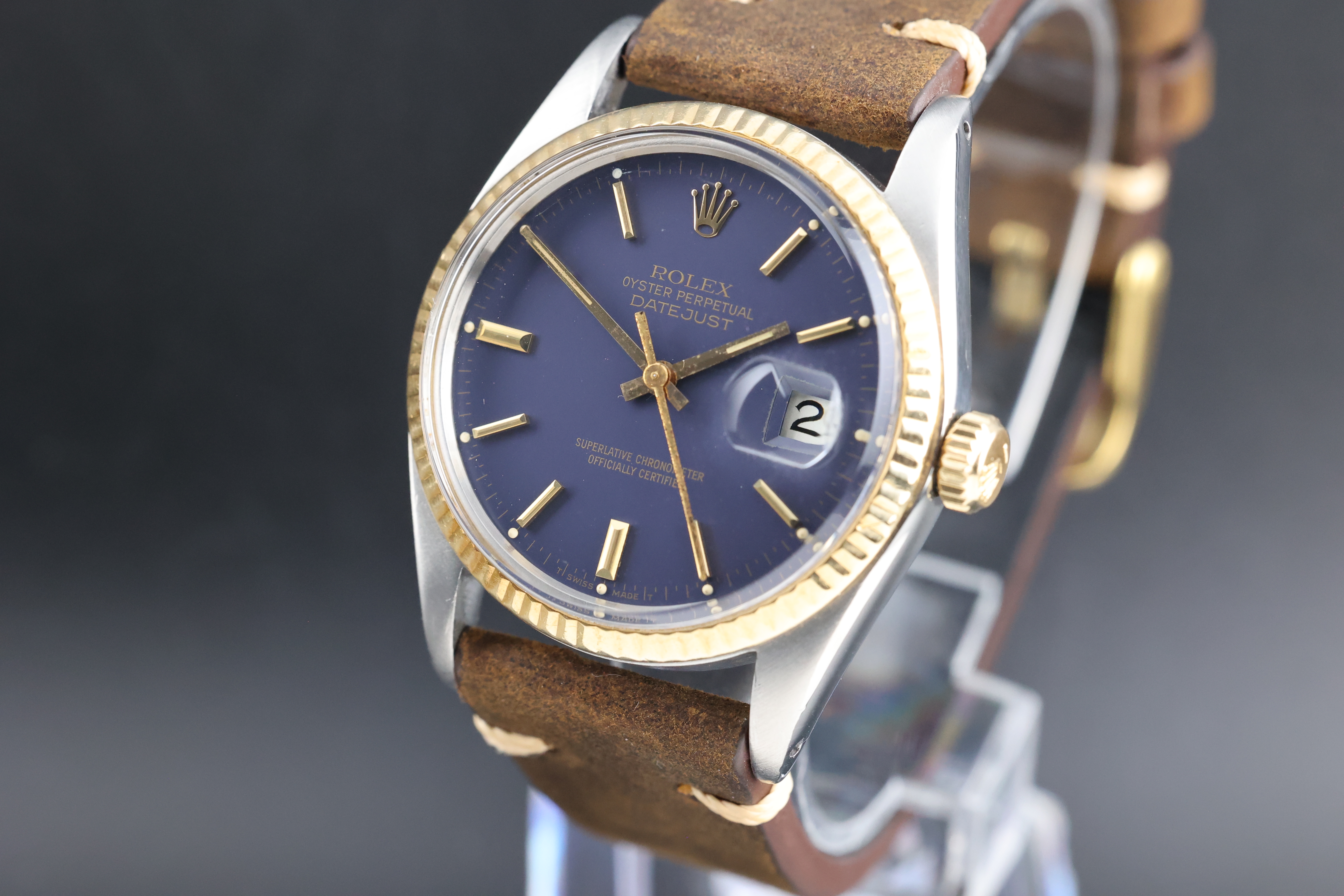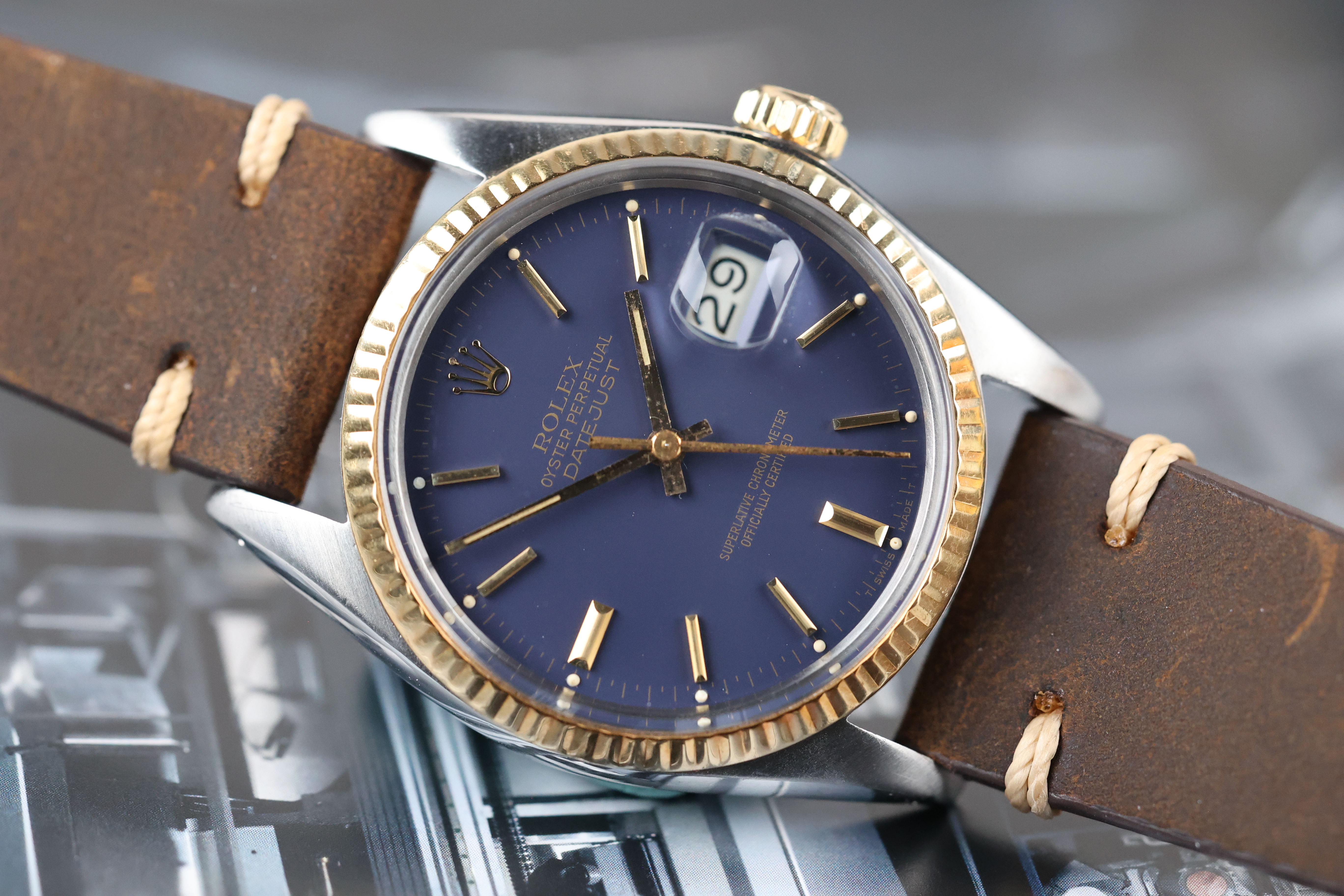 A stunning example of the classic 1978 Rolex Datejust 16013 presents a beautiful matte blue dial in excellent condition. The warm patina on the gold hands adds to its vintage charm, while the fluted 18k yellow gold bezel plays with the light effortlessly. This two-tone Datejust is powered by the Rolex Caliber 3035, a robust automatic movement known for its precision and reliability.