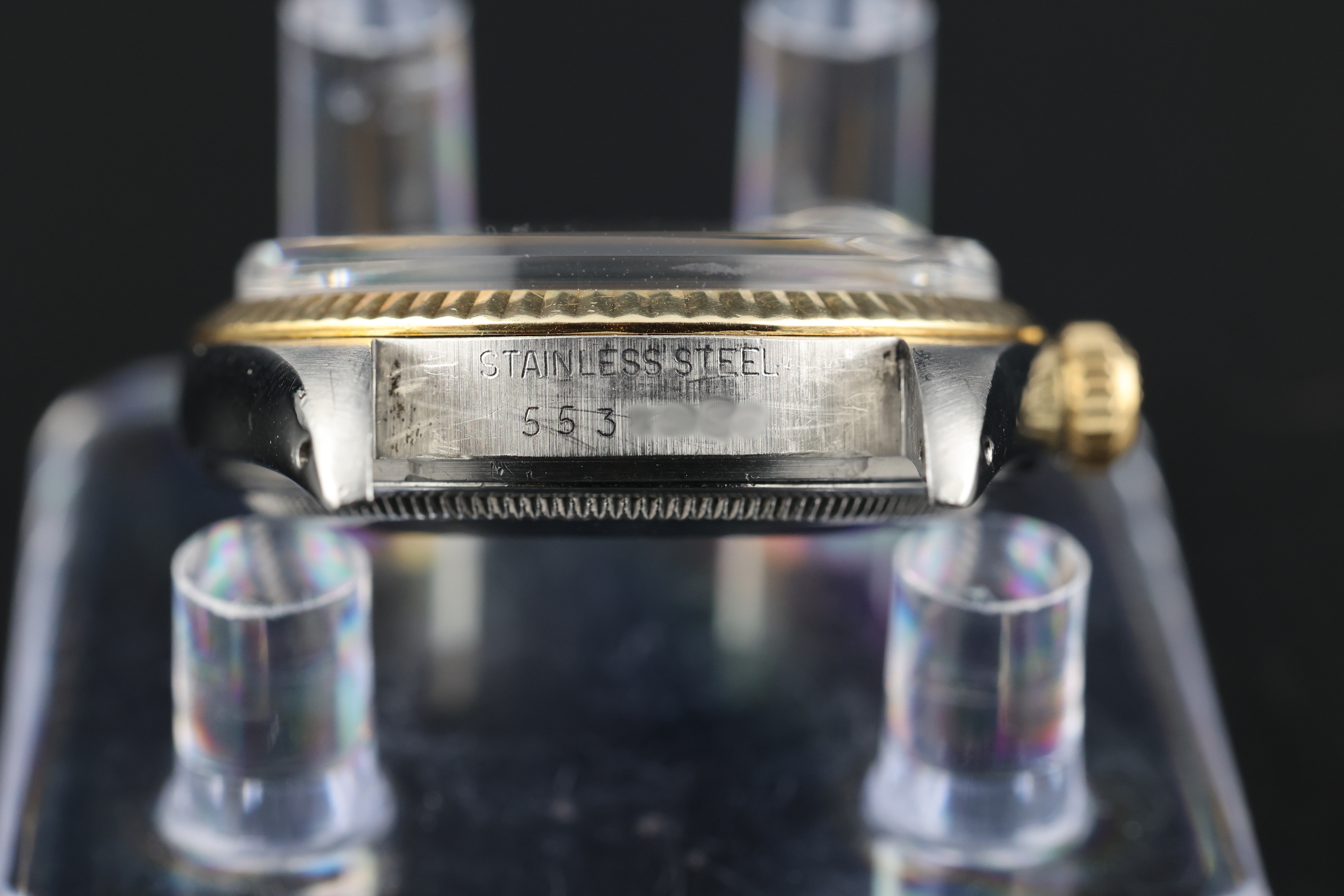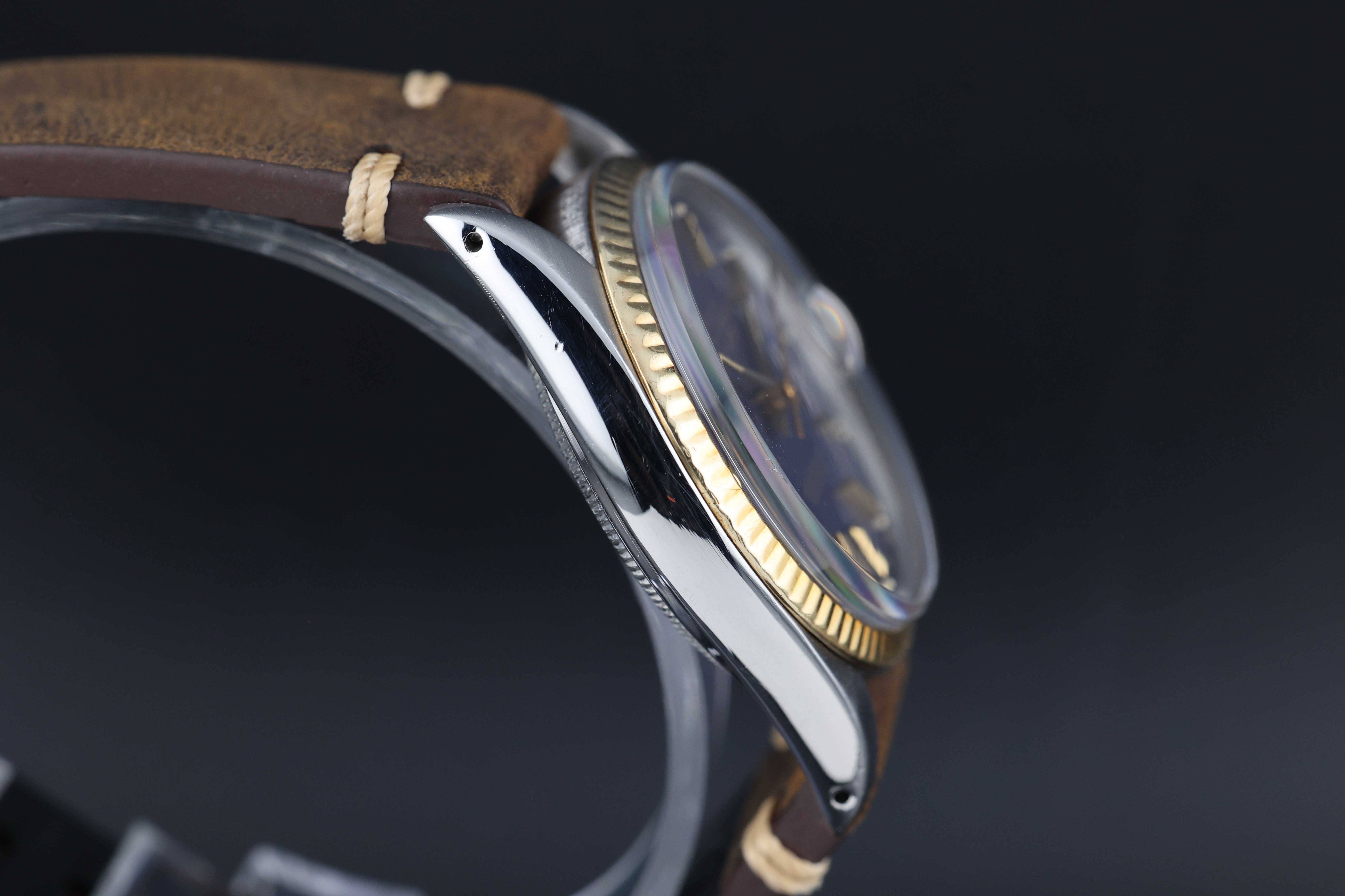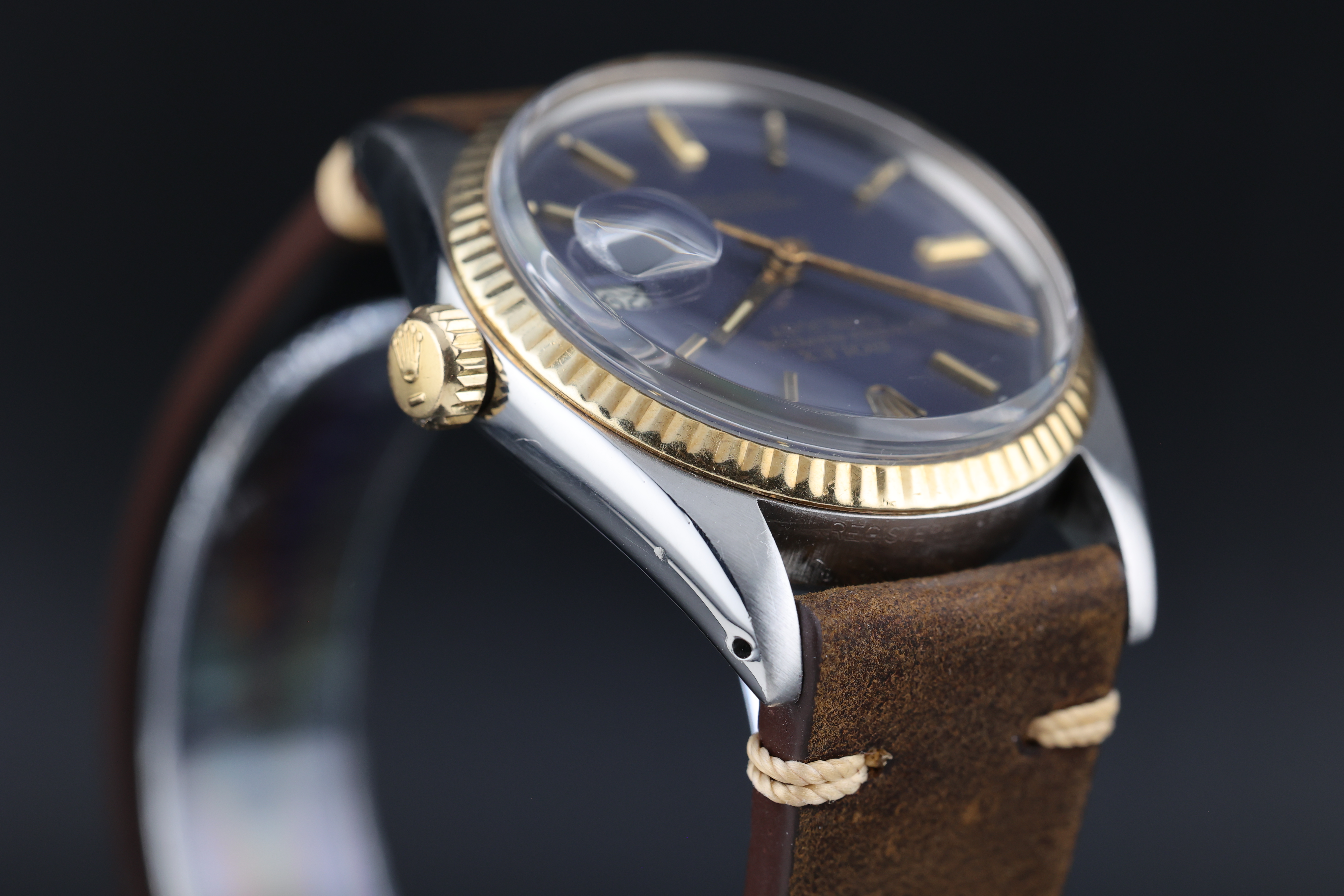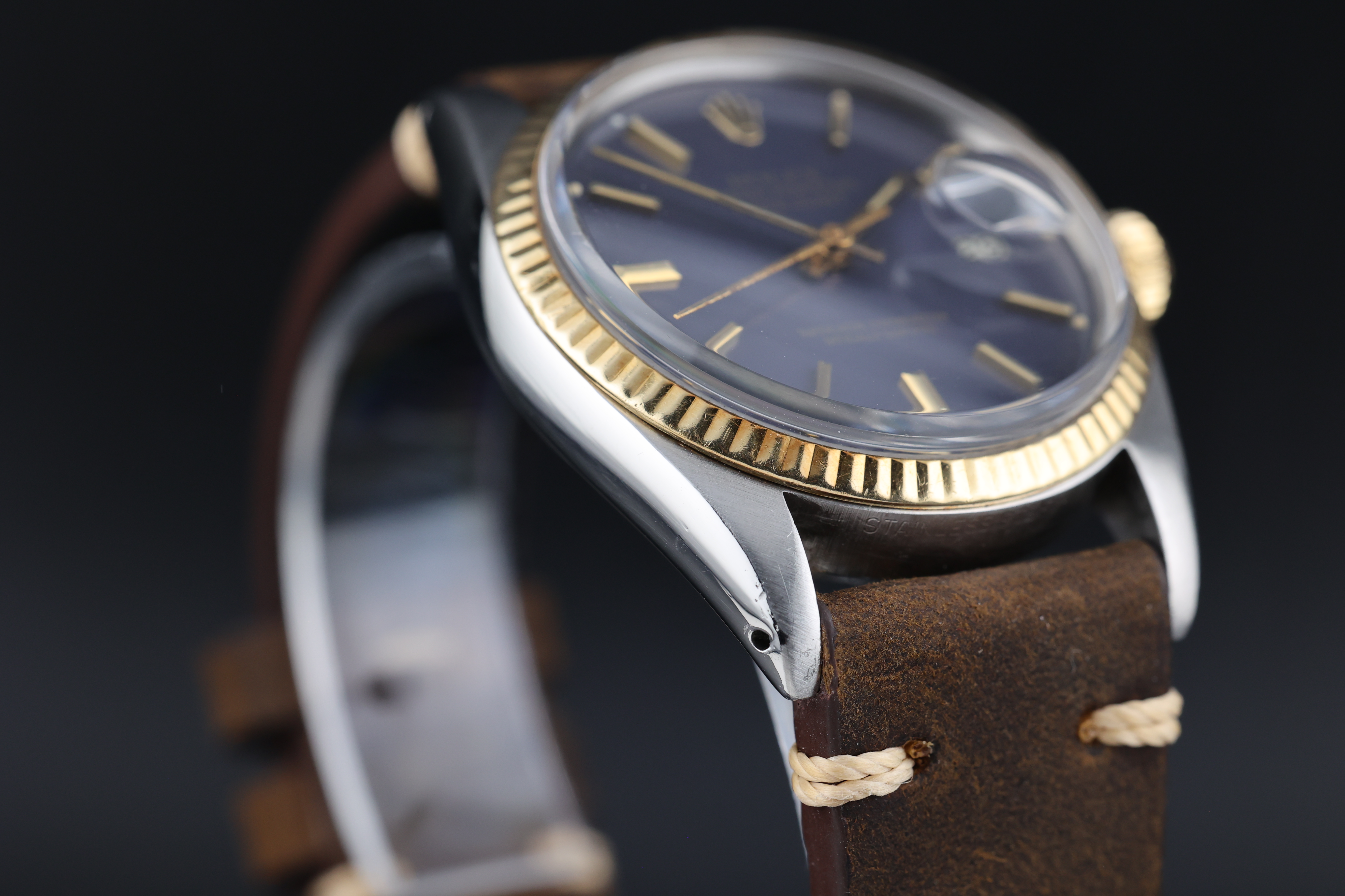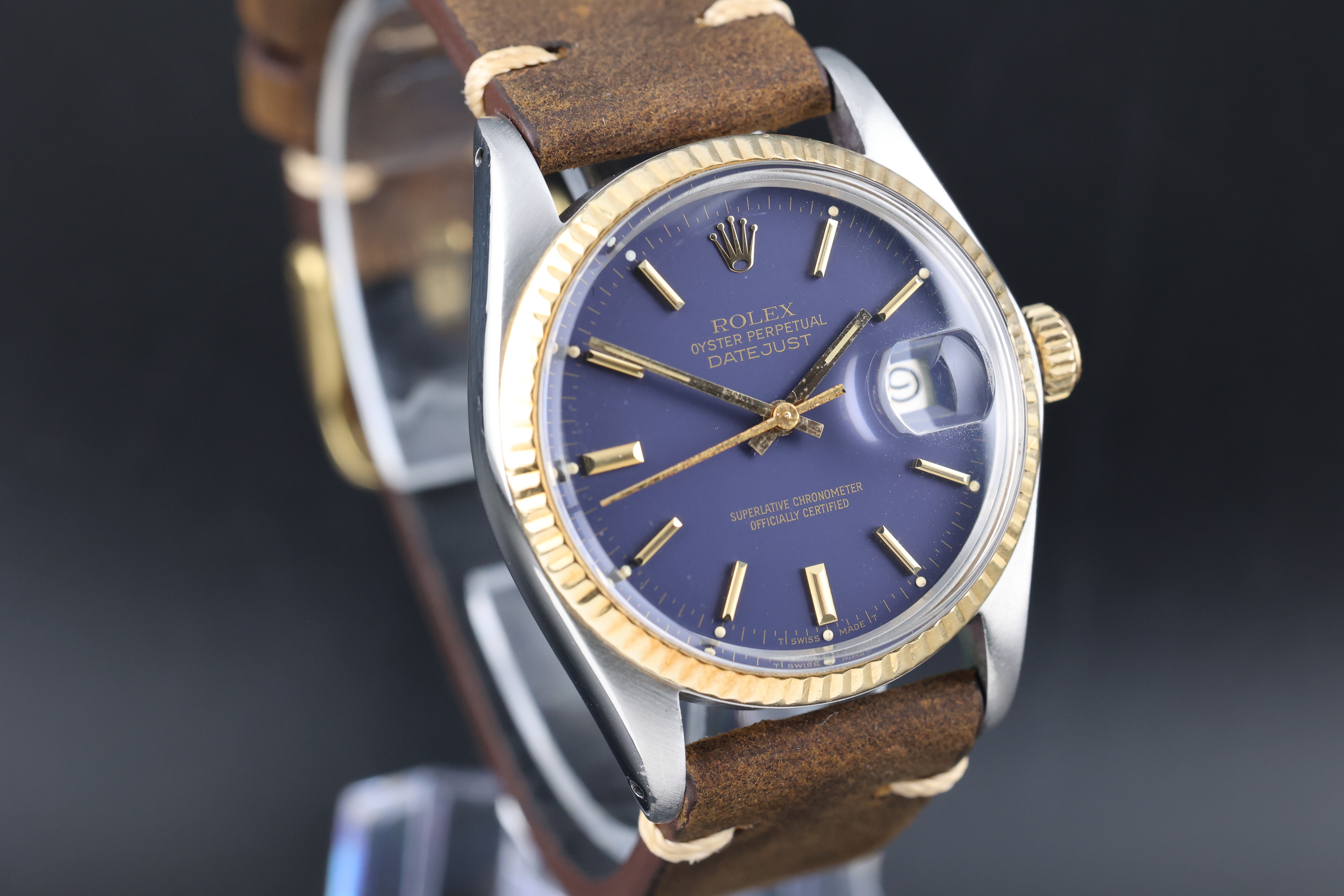 A stunning example of the classic 1978 Rolex Datejust 16013 presents a beautiful matte blue dial in excellent condition. The warm patina on the gold hands adds to its vintage charm, while the fluted 18k yellow gold bezel plays with the light effortlessly. This two-tone Datejust is powered by the Rolex Caliber 3035, a robust automatic movement known for its precision and reliability.
